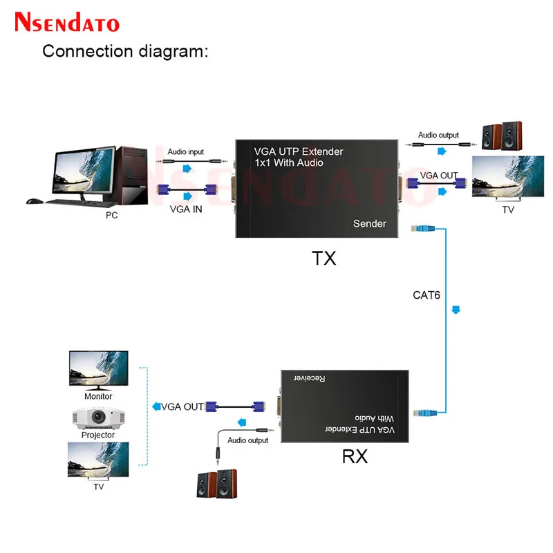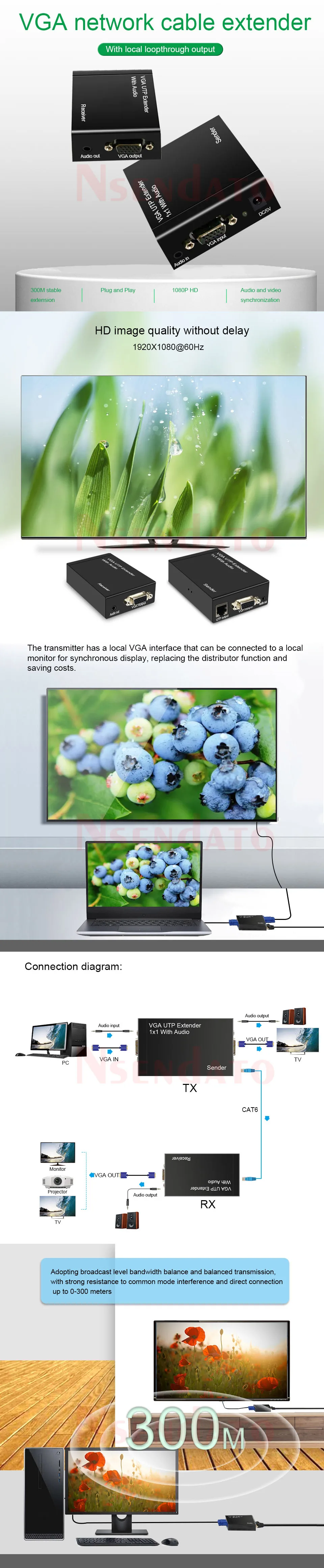 Comprar Divisor extensor VGA UTP con Audio sobre Cat5/5e/6 RJ45, Cable de extensión Ethernet VGA, soporte de 300m para monitores, proyector, HDTV