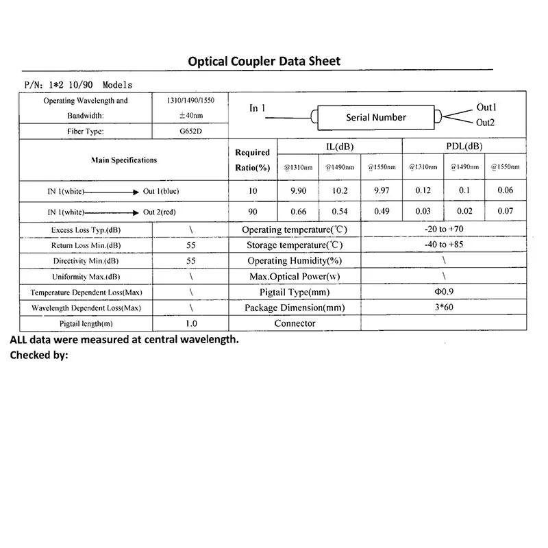 Relación de división 1/99 ~ 50/50 Longitud de onda 1310/1490 / 1550nmTipo de fibra Clase P Longitud 0,5 M/1,0 m/1,5 mTipo de conector Sin conector Cable de entrada/salida 900μm/0,9mmEmbalaje Tubo de acero Pérdida de retorno ≥ 55dBTemperatura de funcionamiento-40 °C ~ + 85 °C Temperatura de almacenamientoModelo: Divisor de fibra 1 punto 2, núcleo único monomodo