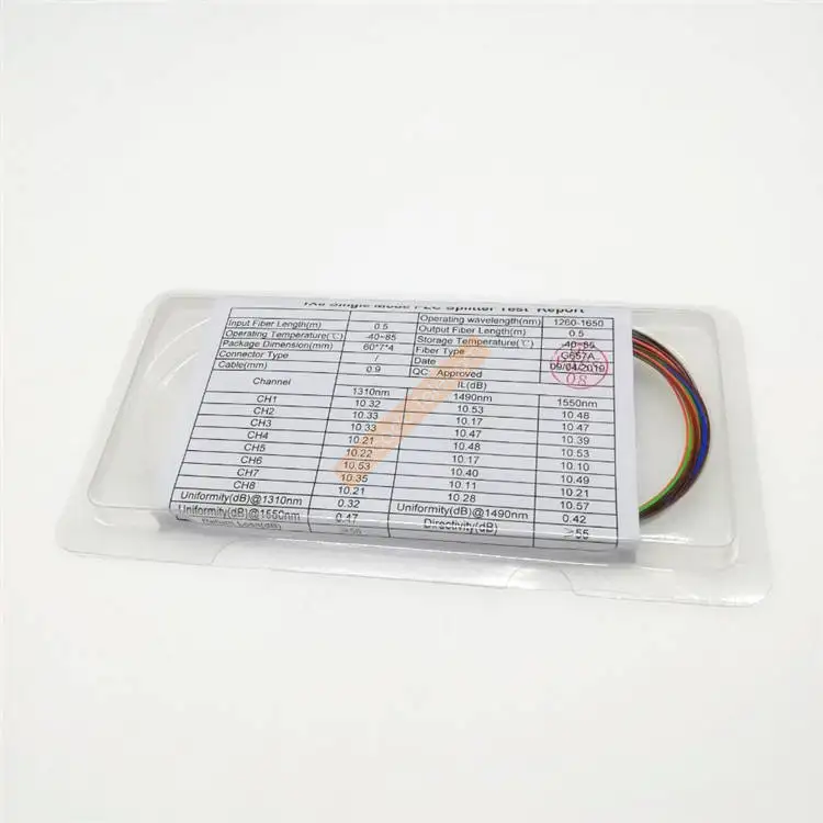 ParámetroEspecificaciónLongitud de onda de funcionamiento (nm)1260 ~ 1650Tipo1x41x81x162x42x82x161x322x321x64Pérdida de inserción (dB) Máx. * 7.3 10.5 13.5 7.6 11.2 14.5 16.2 18.2 20.5Uniformidad (dB) Máx. * 0.8 1.0 1.5 1.0 1.5 2.0 2.0 2.5 2.5PDL(dB) máx. * 0.2 0.2 0.3 0.3 0.3 0.4 0.3 0.4 0.3Directividad (dB)≥55Pérdida de retorno (dB)UPC ≥ 55 APC ≥ 60Temperatura de funcionamiento (°C)-5~ +75Temperatura de almacenamiento (°C)-40 ~ +85Longitud fibra1m o longitud personalizadaTipo fibraFibra de fibra de Corning,Tipo conectorPersonalizado definidoManejo de potencia (mW)300