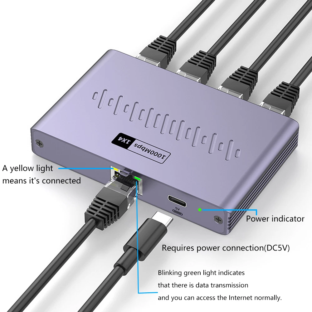 El conmutador Ethernet admite conexión Gigabit Ethernet, utiliza cables CAT6/7/8, proporciona velocidad Gigabit Ethernet, garantiza una transmisión de datos rápida y estable, transferencia de archivos, transmisión o juegos en línea (Nota: dos computadoras comparten un ancho de banda de red de 1000 M, la velocidad real depende del dispositivos y red conectados, se proporciona un cable de alimentación tipo C de 1M y 5V)