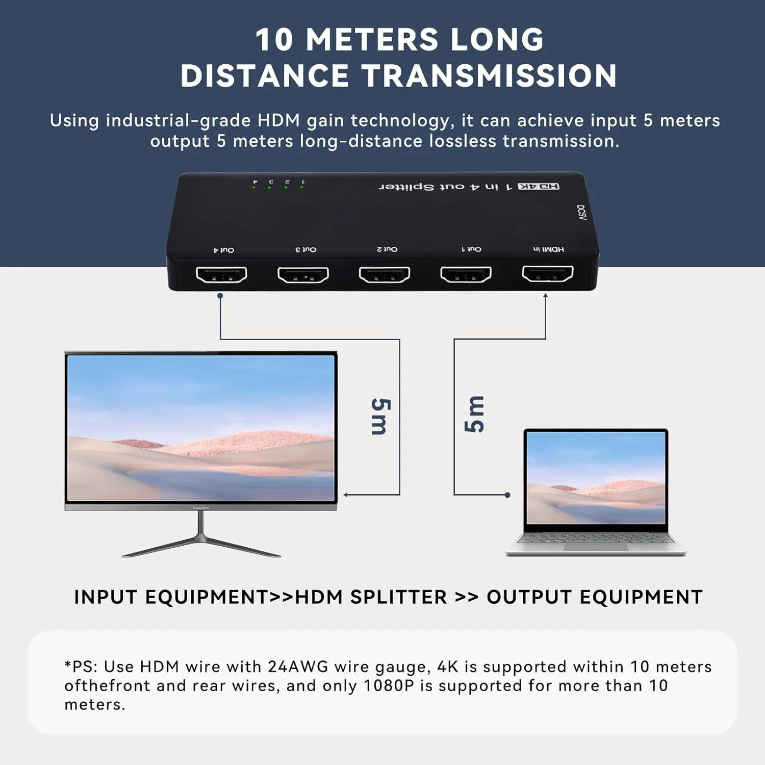 【Transmisión rápida y estable】Este divisor de vídeo HDMI utiliza un procesador moderno para proporcionar la velocidad de transmisión de vídeo y audio más rápida.Para lograr una resolución de 1080P con el divisor HDMI, utilice un cable HDMI 2.0 AWG 26, con longitudes de entrada y salida que no exceden los 8 m/26 pies y una longitud total de 52 pies.Para resolución 4K, utilice un cable HDMI 2.0 AWG 26 con longitudes de entrada y salida de hasta 5 m/16 pies y una longitud total de hasta 32 pies.Transmisión de señal HDMI más confiable con alimentación USB adicional