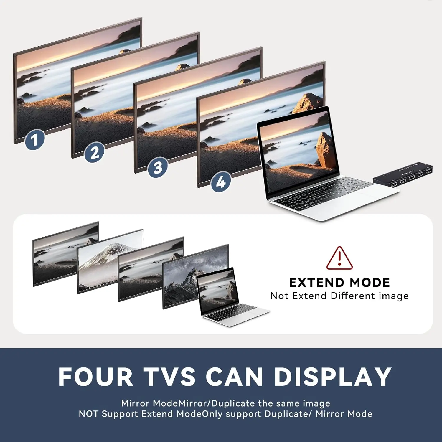 【Contenido de espejo 4K en 4 pantallas】 El divisor HDMI para 4 monitores admite 3D, UHD 4K@60Hz, QHD 2K@120Hz, 1080P@30Hz y es compatible con versiones anteriores. Para resolución 4K, la frecuencia no puede ser superior a 60Hz.No es compatible con HDCP2.2.Si conecta 1 o 2 monitores con diferentes resoluciones y velocidades de actualización, la resolución real y la frecuencia de actualización serán limitadas por el rendimiento del monitor inferior y se mostrarán como la resolución del más bajo.