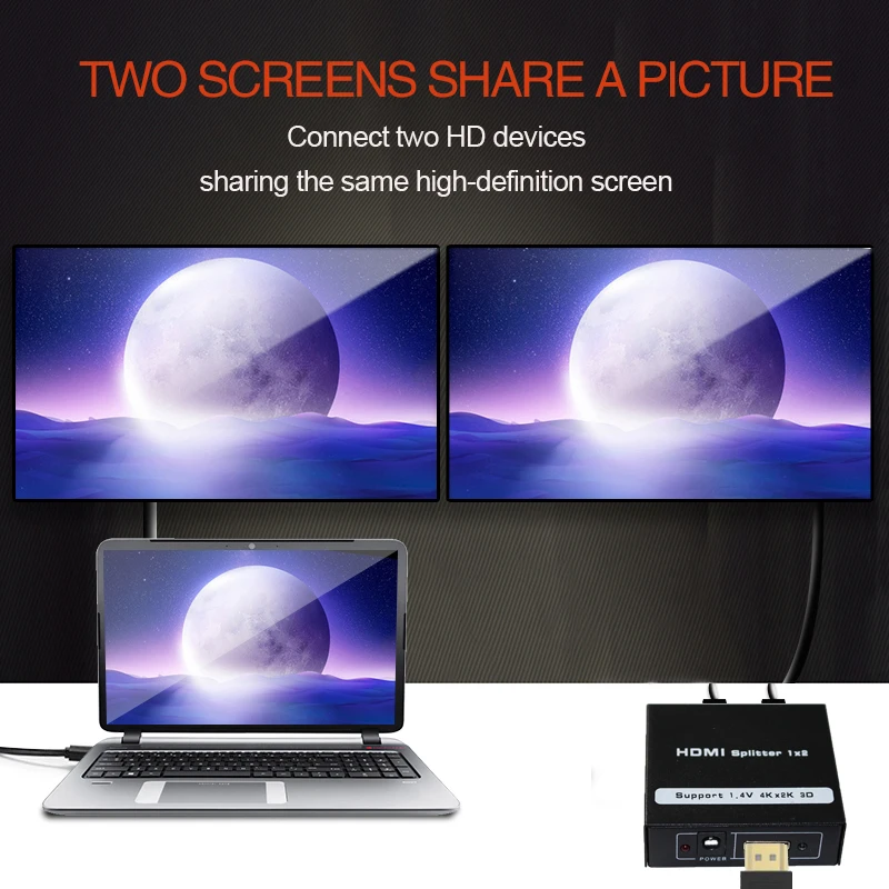 1. El divisor 1x2 HDMI distribuye: 1-fuente HDMI a 2 pantallas HDMI simultáneamente