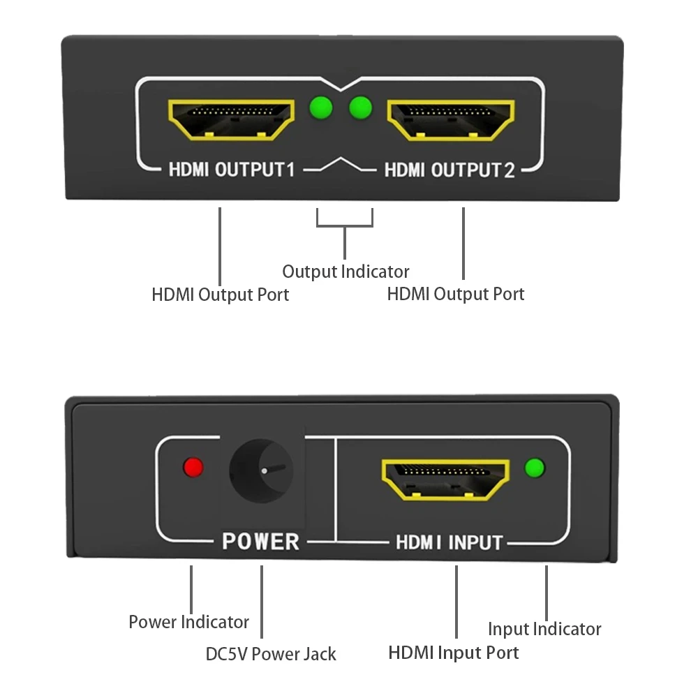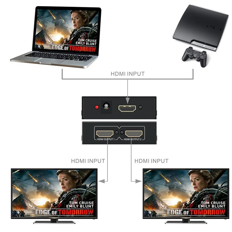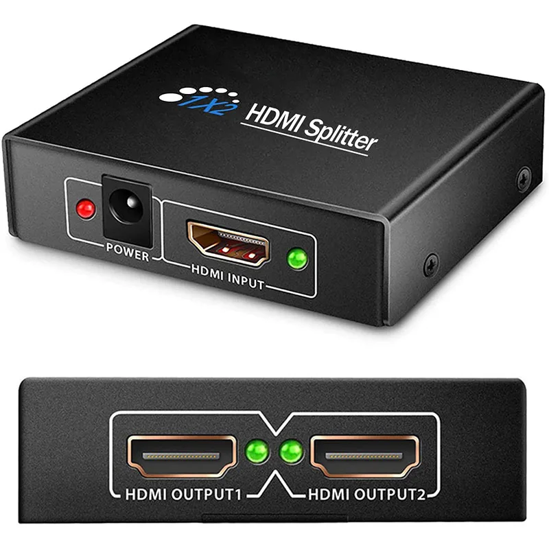 El divisor 1x2 HDMI distribuye 1 fuente HDMI a 2 pantallas HDMI simultáneamente.