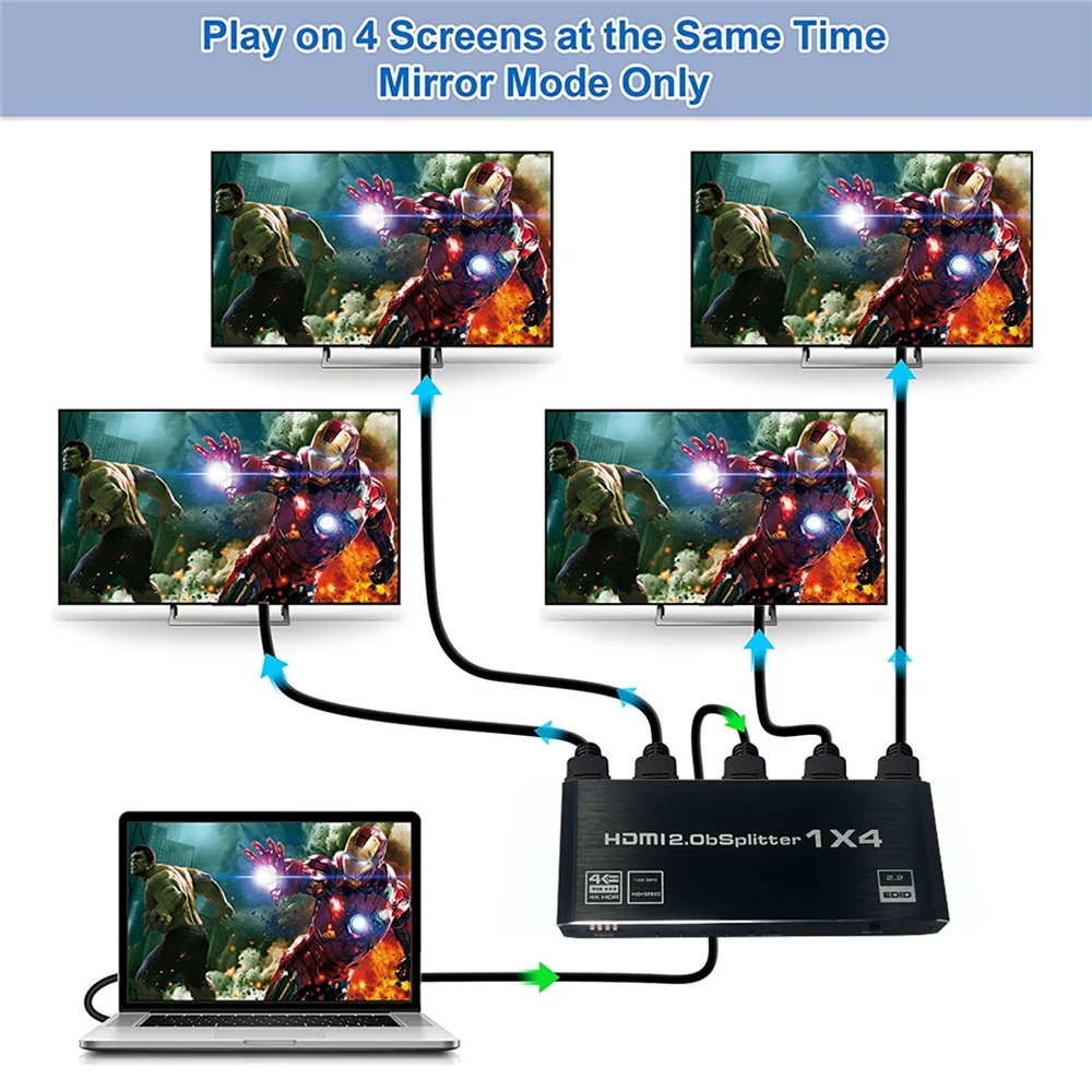El divisor HDMI de 4 puertos le permite distribuir una sola fuente HDMI a más de una pantalla.