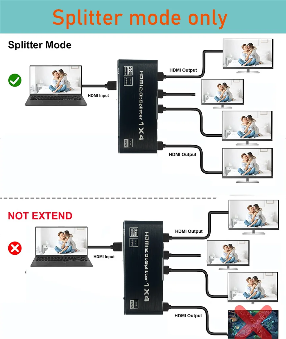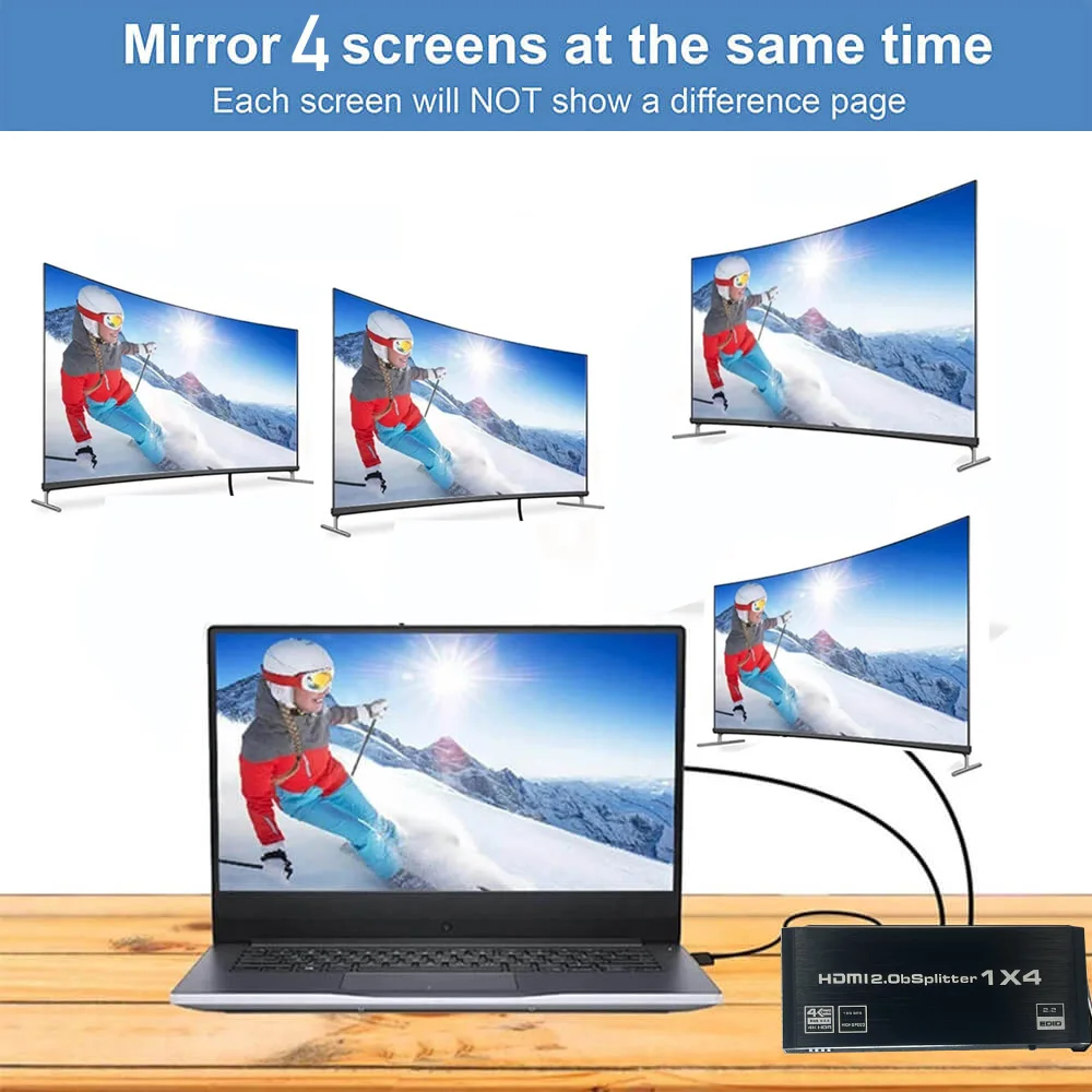2). El artículo enumerado anteriormente es un divisor HDMI y todas las salidas solo pueden mostrar el mismo contenido.