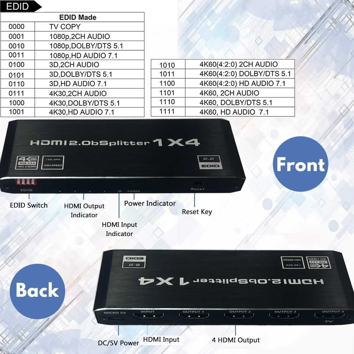 Admite resoluciones de vídeo de hasta 4K a 60Hz y cumple con los estándares HDMI 2,0 y HDCP 2,2. Cuenta con funciones EDID, puede reducir una señal de vídeo 4K a 1080p.