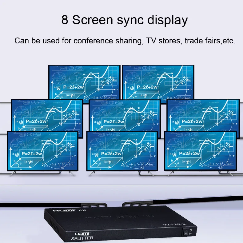 El dispositivo se puede dividir fácilmente en 2, 4 u 8 monitores o proyectores compatibles con HDMI. Además, se puede colocar al final de
