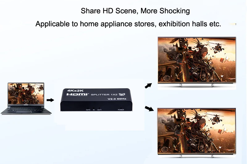 Este divisor 1x2 1x4 o 1x8 HDMI 2,0 utiliza una sola fuente HDMI, accediendo a múltiples sumideros HDMI. Permite un HDMI