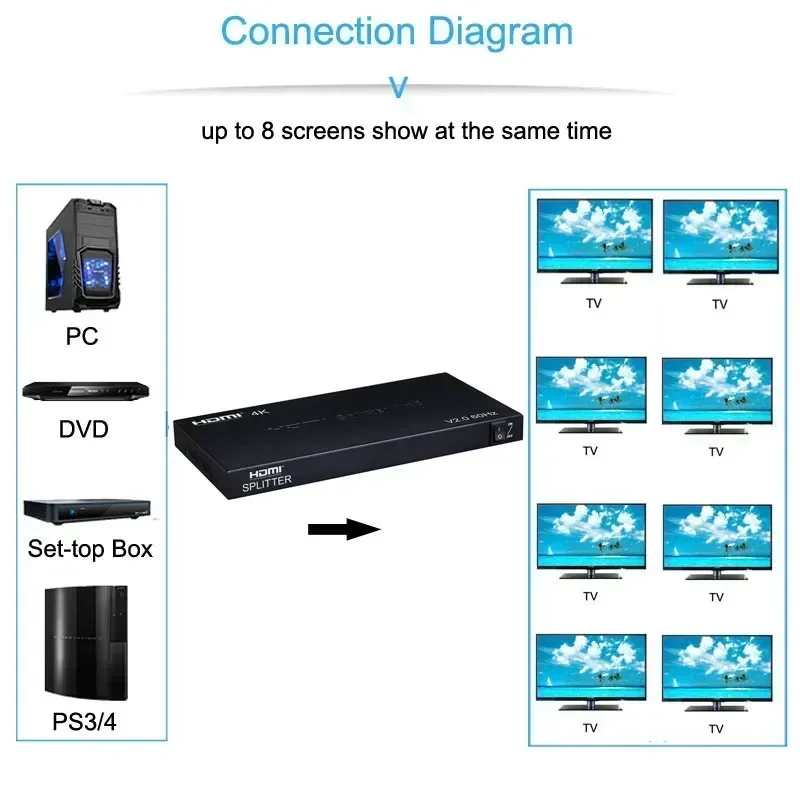 Comprar Divisor HDMI 2,0 para monitores de TV, convertidor de vídeo 1080P, 4K, 60hz, 1x8, 1 en 2, 4, 6, 8 salidas, 1x2, 1x4, PS4, PC, DVD