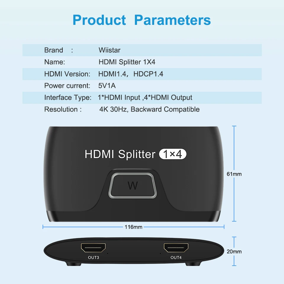 * HDMI 1X4 Splitter Max soporte 4K 30Hz, la versión HDMI es HDMI 1,4
