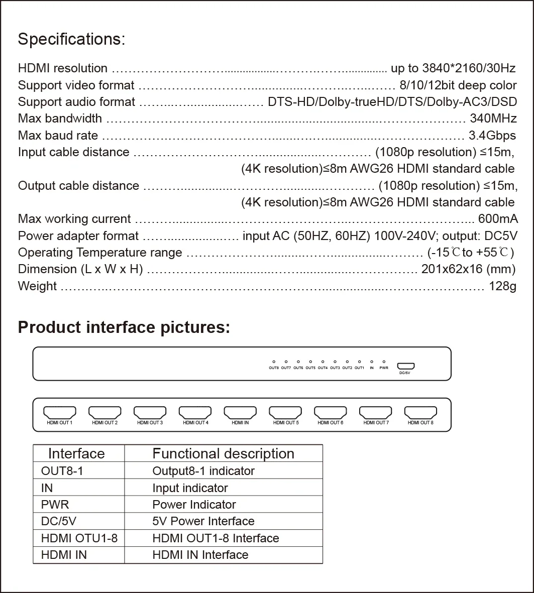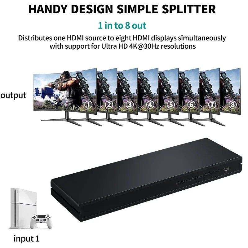 Divisor HDMI 4K 1x8, convertidor distribuidor de vídeo 1 en 8 salidas, adaptador multipantalla para PS4, Xbox, cámara DVD, portátil a proyector de TV