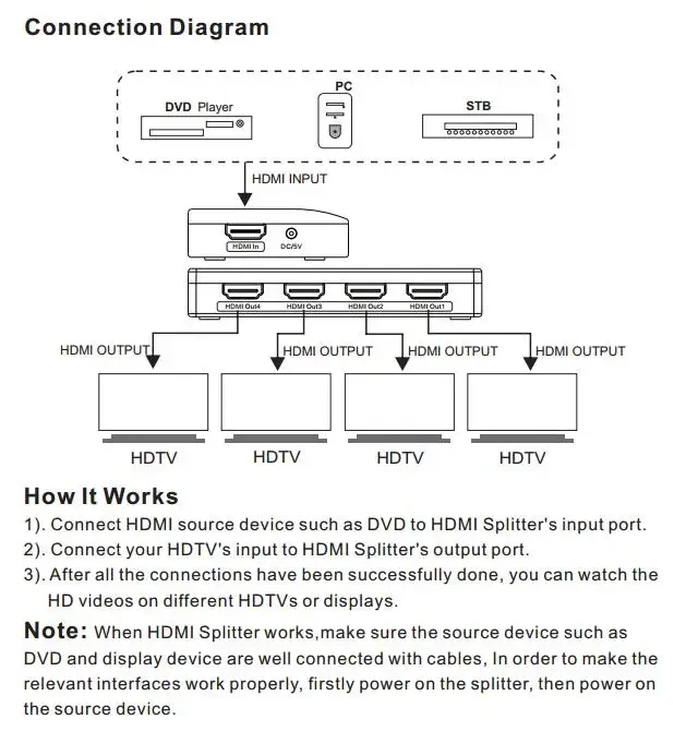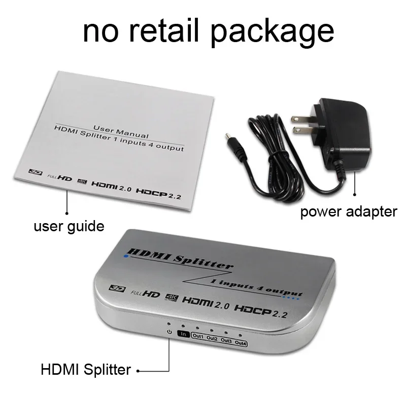 Contenido del paquete: Divisor HDMI 4X1 x1 Adaptador de corriente x1 Manual de usuario x1 SIN caja de paquete al por menor, si es necesario, contáctenos antes de comprar