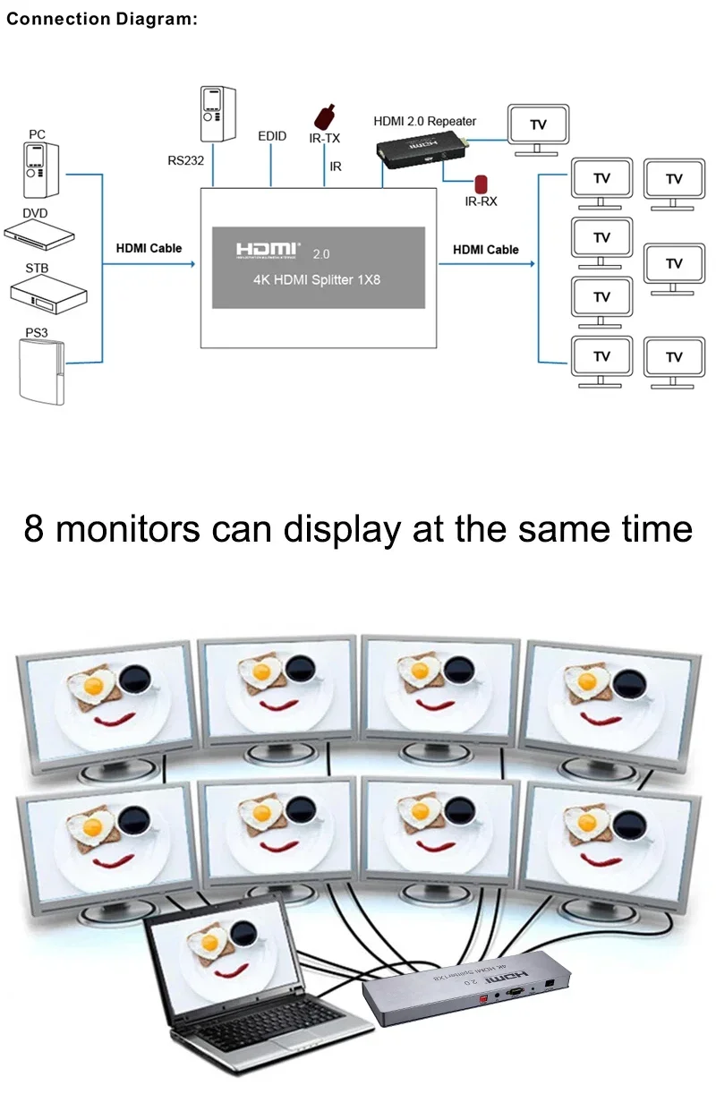 8. Admite una sola fuente HDMI, con acceso a múltiples lavabos HDMI, la fuente puede ser un reproductor de DVD, un decodificador de TV, una PC, etc.