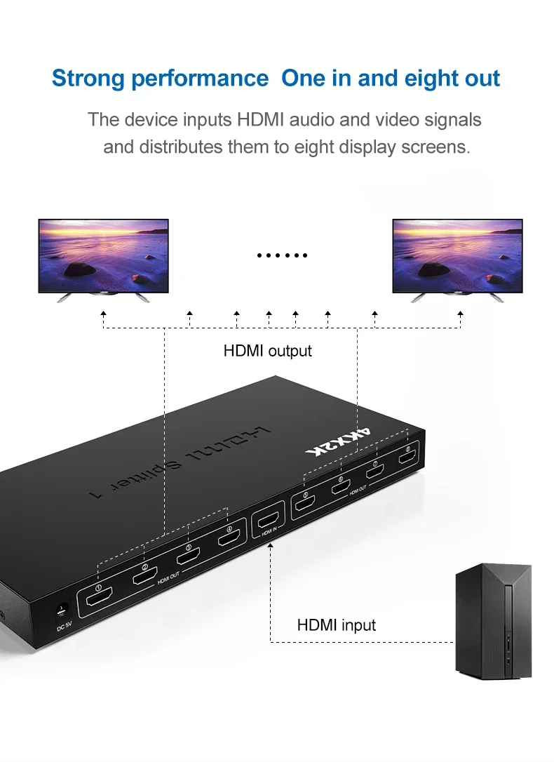 El divisor 1 × 8 compatible con HDMI permite dividir fácilmente 1 fuente única compatible con HDMI en 8 monitores o proyectores compatibles con HDMI.