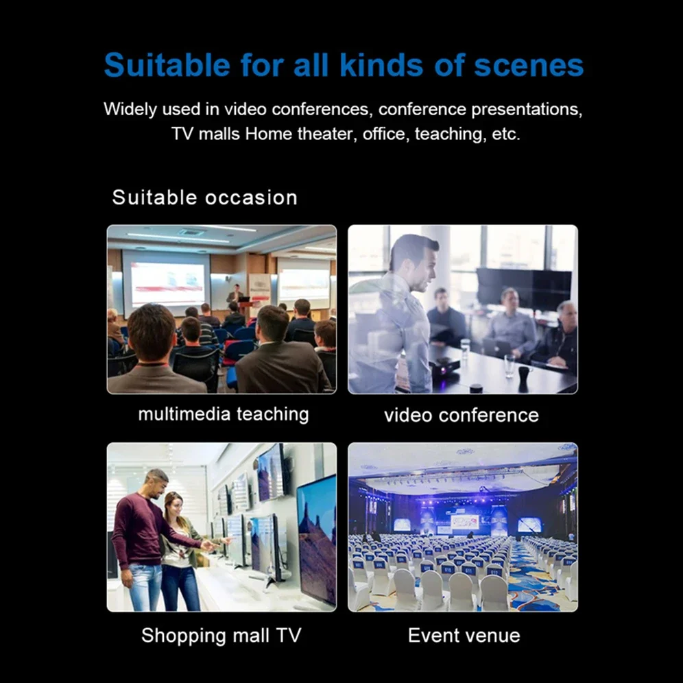 Adecuado para todos los proyectores de equipos HDMI del mercado, como televisores digitales de alta definición, pantallas de plasma, pantallas de cristal líquido, decodificadores, computadoras personales, PS4, DLP, Xbox, reproductores de DVD, Blu-ray, cámaras digitales, receptores de audio y video., vídeo de servicios públicos, sistema, zoom de letras. Es perfecto para fábricas de proyectores, presentaciones de conferencias, entornos de capacitación escolar o empresarial.