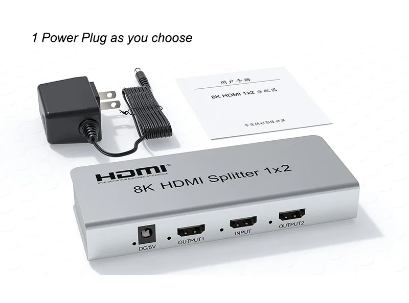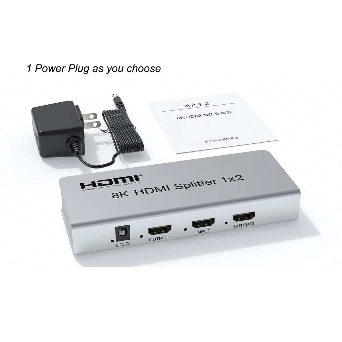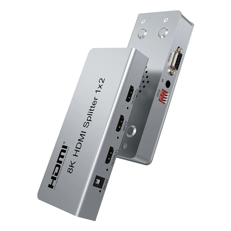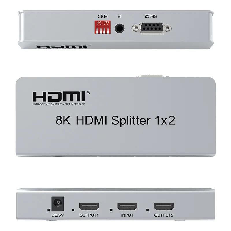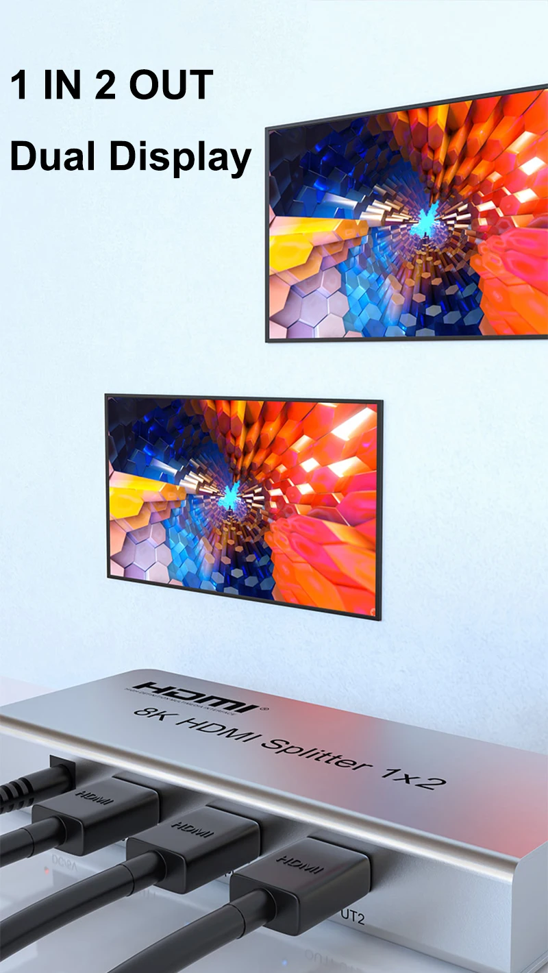 Este divisor HDMI 8K 1x2 utiliza una sola fuente HDMI, accediendo a múltiples sumideros HDMI. Permite un dispositivo HDMI.