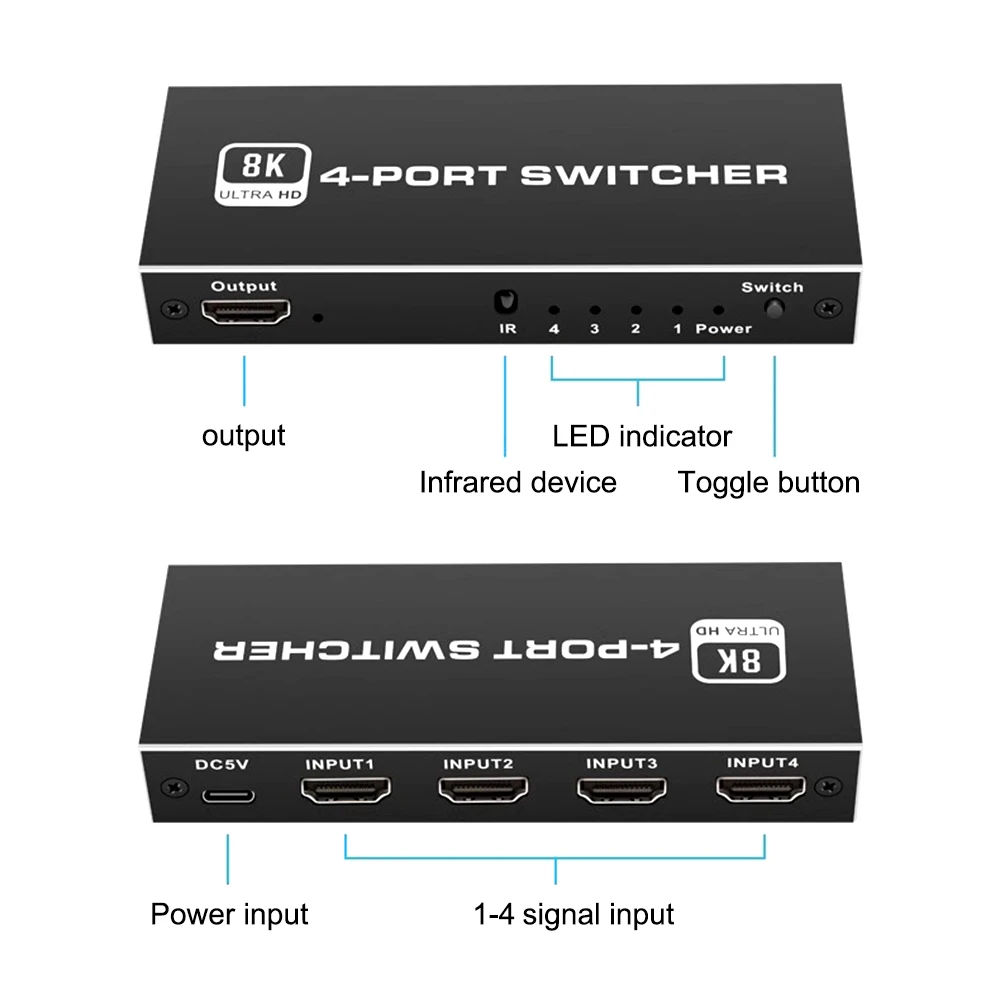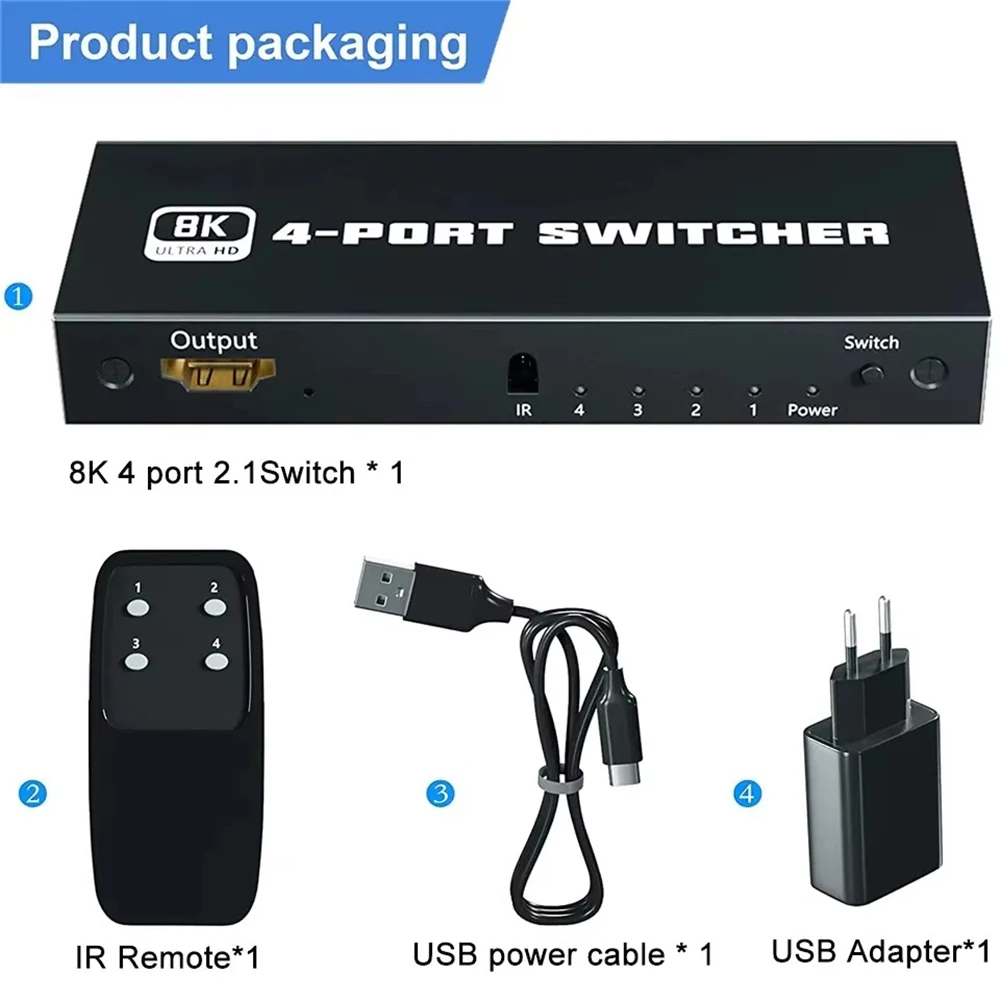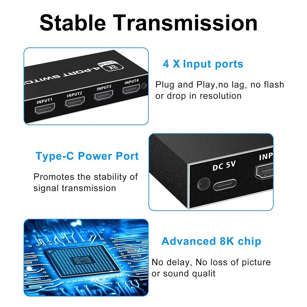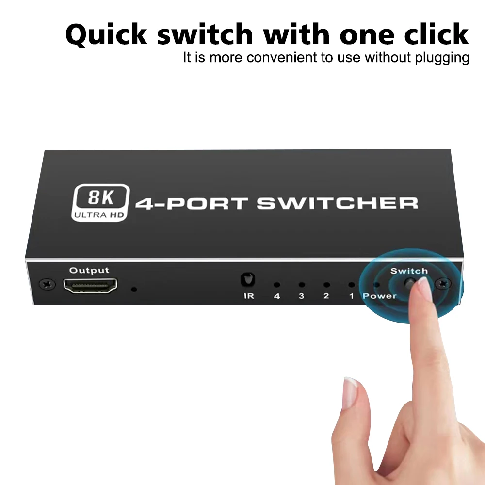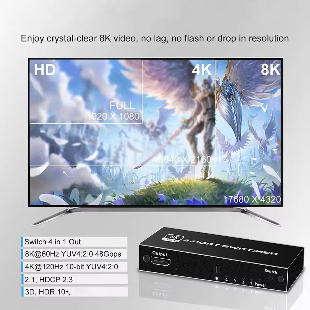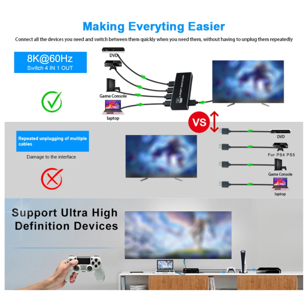 3.[Transmisión estable] 8K@60Hz El interruptor 2.1 Compatible con HDMI adopta el último chip, hecho de material de aleación de aluminio, con una estructura resistente a la corrosión que también puede resistir el sobrecalentamiento o el agrietamiento, lo que lo hace más duradero y práctico.El conmutador Compatible con HDMI es compatible con la mayoría de los dispositivos con interfaces compatibles con HDMI estándar.