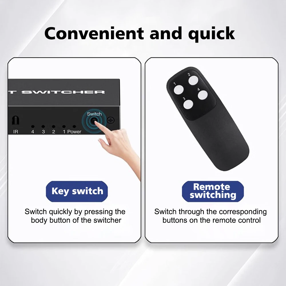 2.[Fácil de conectar] Este interruptor activo Compatible con HDMI admite funciones de conmutación de botones y control remoto, liberando sus manos con el control remoto.La luz indicadora LED le indica qué puerto está activo.Se puede encender para que la transmisión de su señal sea más estable.Plug and play.Es una opción ideal para ferias comerciales, salas de conferencias, dormitorios, salas de estar, cocinas y patios traseros.