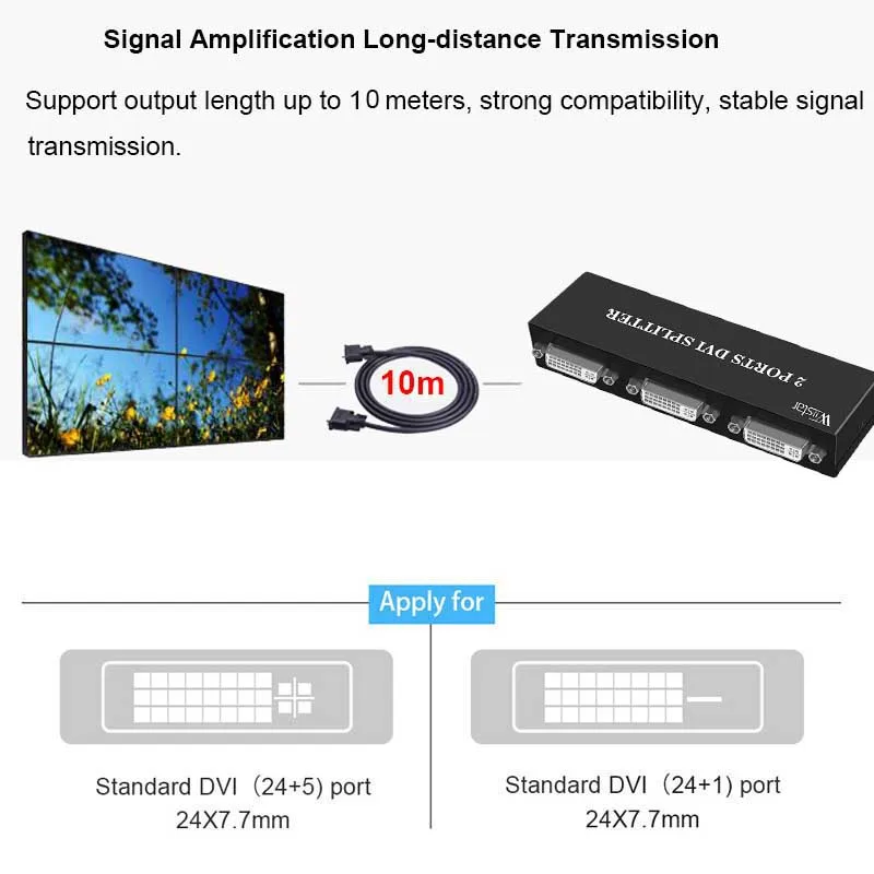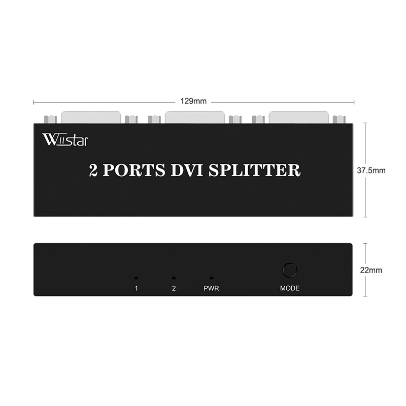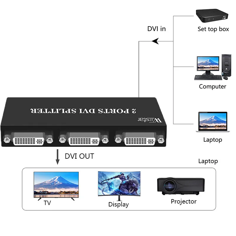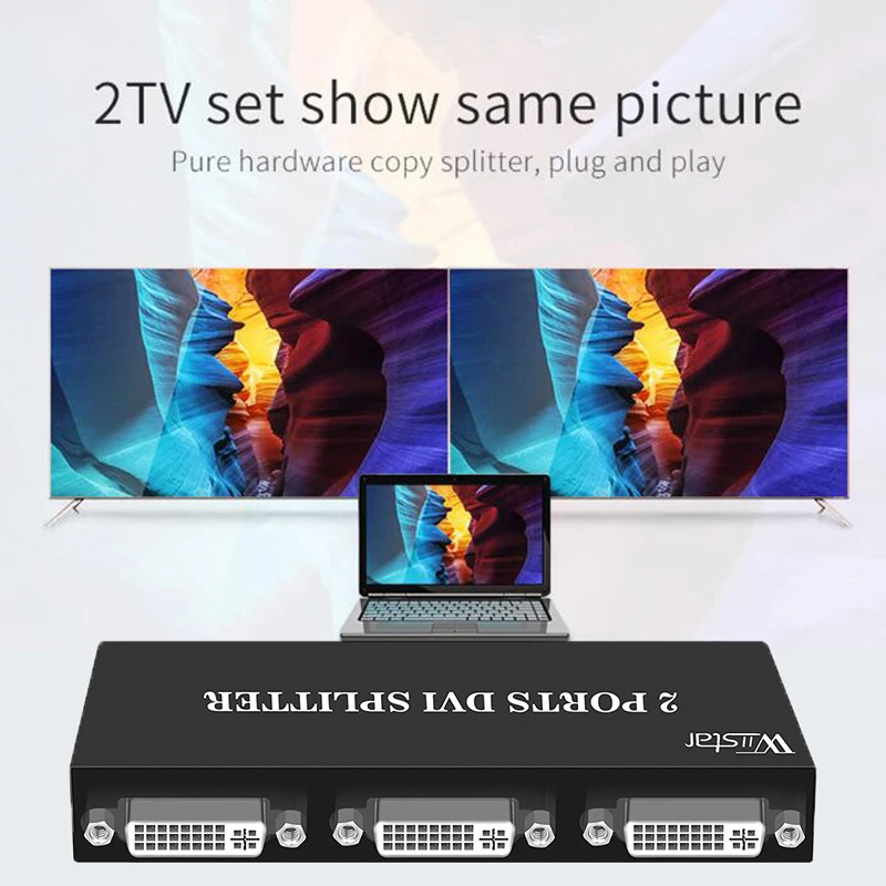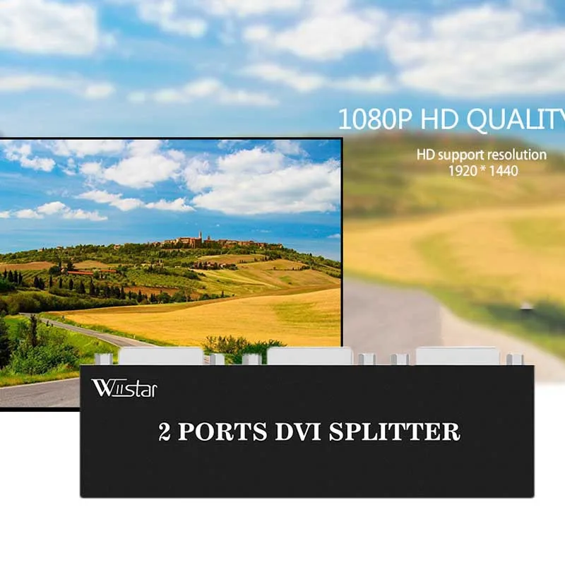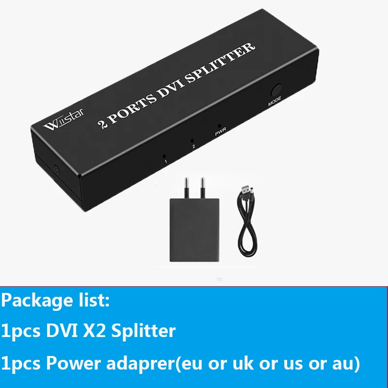 With the WIISTAR DVI Switch, you can connected 1 video source to 2 Display Dvices.Product Feature:Input:1x DVIOutput:2x DVISupport HD DVI with high resolution up to 2048x1536@30hzSignal transmission distance up to 10mSuitable for high resolution screen with DVI interfaceSupport UXGA, bandwidth up to 165MHzCascade function with more displaysSupport HDTVPower supply: DC 5VOPERATIONG AND CONNECTION:1. Connect one DVI-D cable from a DVI signal source into the input port of splitter.2. Connect DVI-D cables from TV/Monitor into the DVI output ports of splitter.3. Connect DC plug of AC adapter to DC jack and inserted into the power socket.Package Included:1 x User Manual