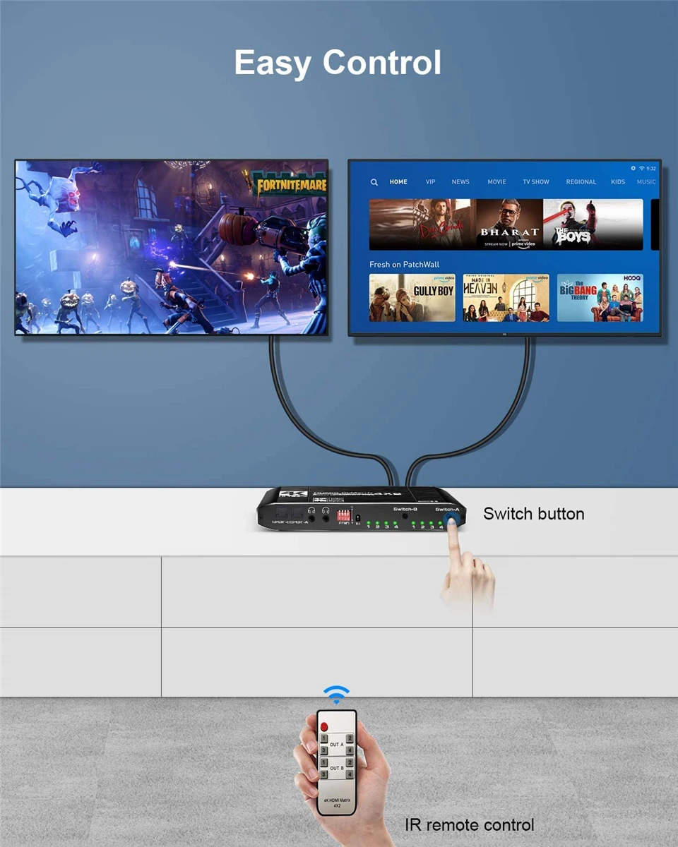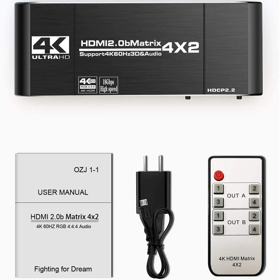 Navceker 4x2 HDMI Matrix Switch es con 4 entradas HDMI y 2 salidas HDMI, por el momento. Es una matriz verdadera y puede distribuir cualquiera de las 4 fuentes a cualquiera de las 2 pantallas, y puede funcionar como un divisor para mostrar la misma fuente en 2 pantallas simultáneamente. Admite resoluciones de entrada y salida de hasta 4K x 2K/60HZ