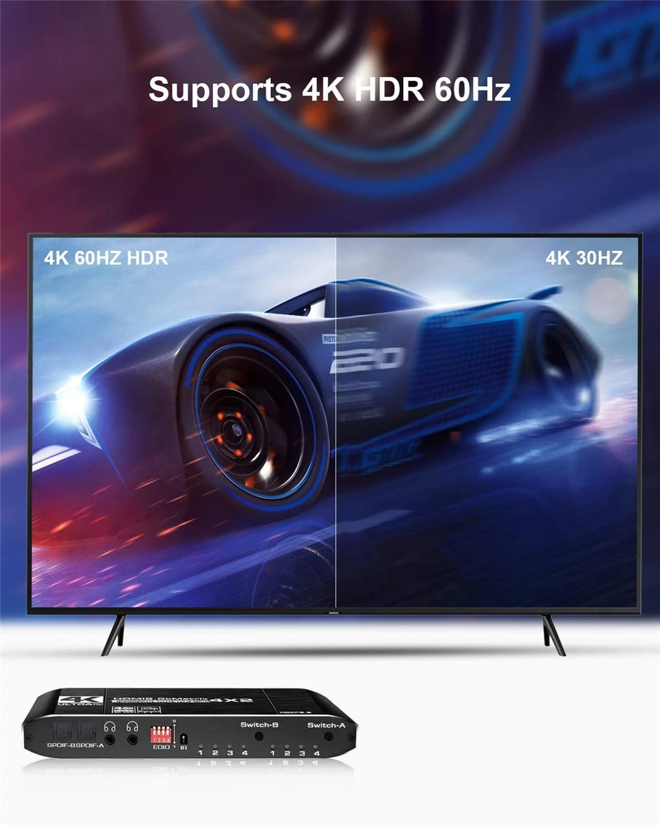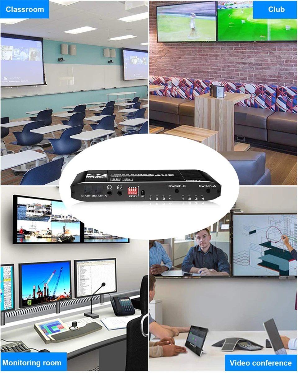 [Matriz HDMI de 4 entradas y 2 salidas] La matriz HDMI le permite conectar cuatro fuentes de señal 4K HDR a dos pantallas o proyectores HD al mismo tiempo. Es la combinación de divisor HDMI e interruptor. Cualquier puerto de salida puede realizar una salida de audio independiente por SPDIF/fibra óptica o auriculares estéreo L/R. La carcasa de aleación de aluminio proporciona durabilidad y ayuda a disipar el calor. Conveniente para el trabajo y el hogar, la distribución de información, la presentación en la sala de conferencias, la escuela y los entornos de capacitación corporativa.