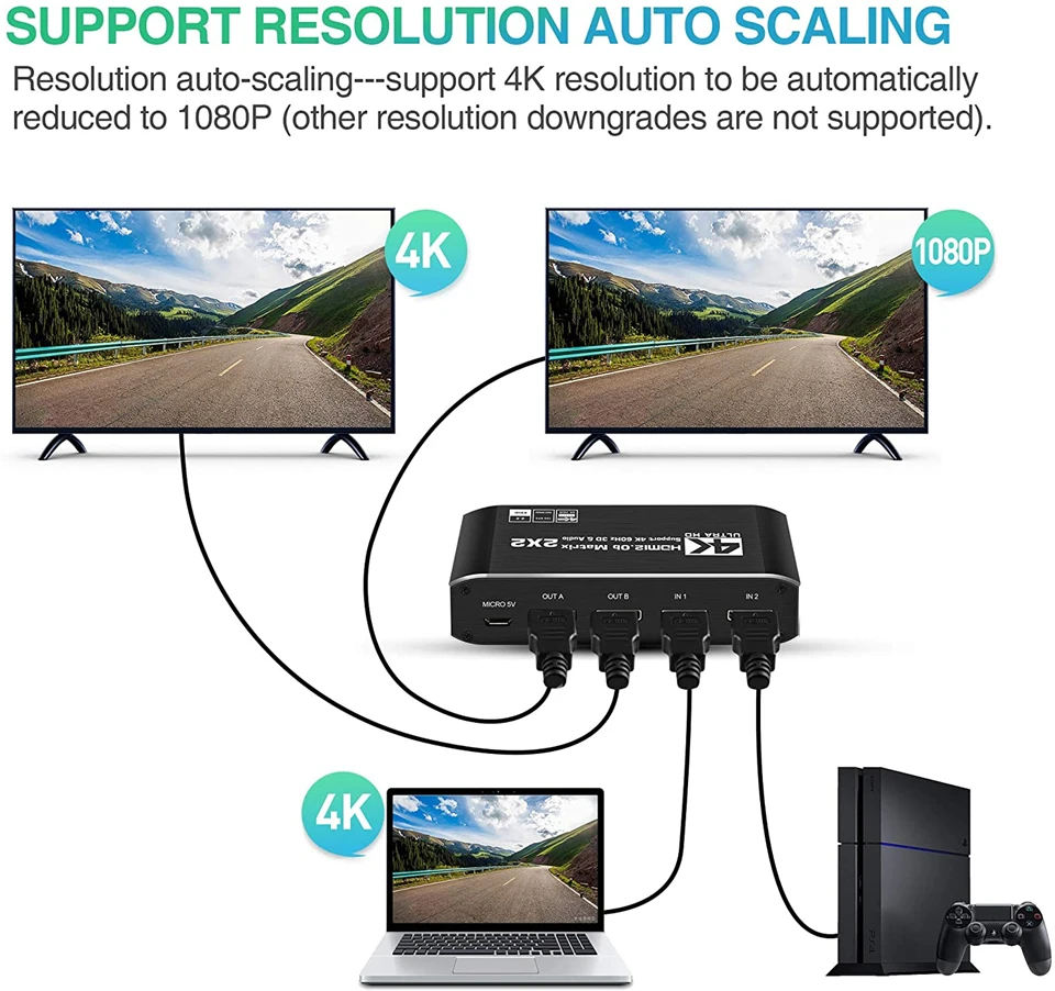 ★【RESOLUCIÓN AUTO ESCALADO】-Soporte para reducir automáticamente la Resolución 4K a 1080P (otras degradaciones de resolución no son compatibles). La señal 4K se puede mostrar simultáneamente en un monitor que admita 4K y un monitor que admita hasta 1080P. Conecte un dispositivo de visualización de menor resolución al puerto OUT A.