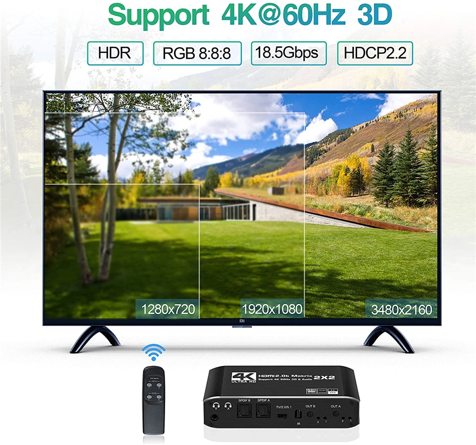 (1) El color negro es de 2x2 con HDMI 2.0b y HDCP 2,2, 4K @ 60Hz HDMI Matrix Switch 2x2 con HDR10, Audio 2xSPDIF, 2x3,5mm L/R Audio,Downscaler 4K a 1080P y RGB 4:4:4/8:8:8(Dolby ATMOS).(2) El color rojo es de 1/2 ", HDMI 2.0b y HDCP 2,2, 4K @ 60Hz HDMI Matrix switch 3x2 con HDR10, Audio 2xSPDIF, 2x3,5mm L/R Audio,Downscaler 4K a 1080P y RGB 4:4:4/8:8:8(Dolby ATMOS).(3) es de 2,2 El color blanco, HDMI 2.0b y HDCP, 4K @ 60Hz HDMI Matrix switch 4x2 con HDR10,2xSPDIF Audio, 2x3,5mm L/R Audio,Downscaler 4K a 1080P, RGB 4:4:4/8:8:8(Dolby ATMOS) y 16 tipos de Modo EDID.Características: