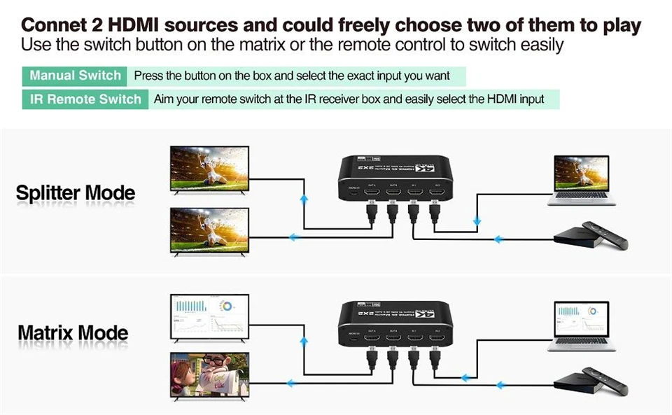 ★【MATRIX 2 IN 2 OUT MATRIX】-La matriz HDMI NAVCEKER4K puede conectar hasta 2 fuentes de señal HD a 2 terminales de pantalla HDMI con fibra óptica o salida de auriculares estéreo, Permite cambiar o dividir fácilmente dos dispositivos HDMI en dos pantallas HD con botones o controles remotos. El Puerto de la fuente de alimentación está diseñado para estar en el mismo lado que todos los puertos HDMI para una fácil conexión. Soluciones adecuadas para cine en casa, oficina, escuela, sala de reuniones, centro comercial, hotel o museo.