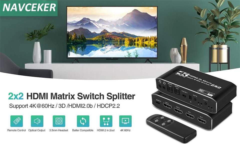 ZY-HM22A,NavcekerHDMI Matrix Switch 2x2 puede conectar 2 fuentes de señal HD a 2 terminales de pantalla HD con fibra óptica o salida de auriculares estéreo. Permite que dos dispositivos HDMI se cambien o dividan fácilmente en dos monitores o proyectores compatibles con HDMI. Y cualquier puerto de salida puede realizar una salida de audio independiente por fibra óptica o auriculares estéreo.