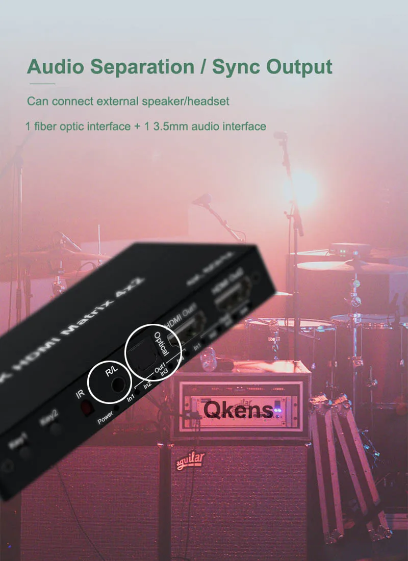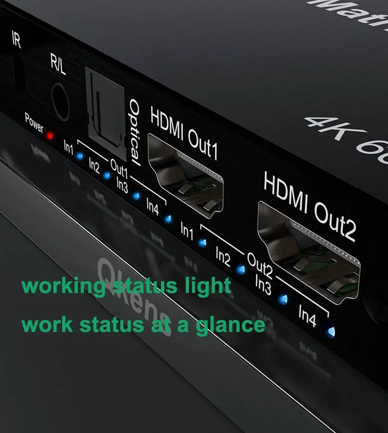 Con fibra óptica y salida de auriculares estéreo al mismo tiempo a través de 1 puerto HDMI. Esta matriz permite cuatro