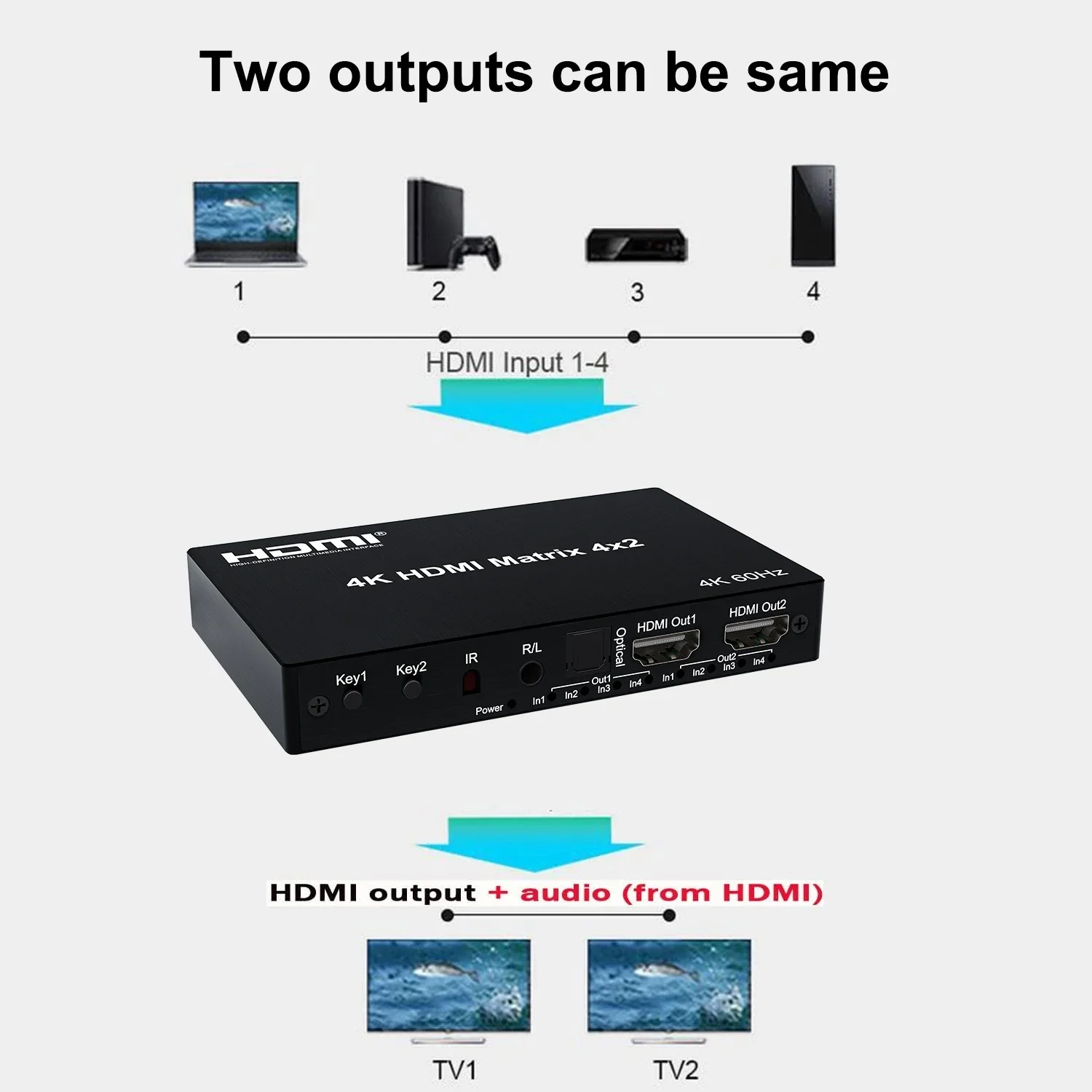 Comprar Divisor de interruptor de matriz HDMI 4K 60Hz 4x2 HDMI 2,0, salida 4 en 2, IR EDID, convertidor de Audio y Video 3D, proyector de PC a TV, pantalla Dual