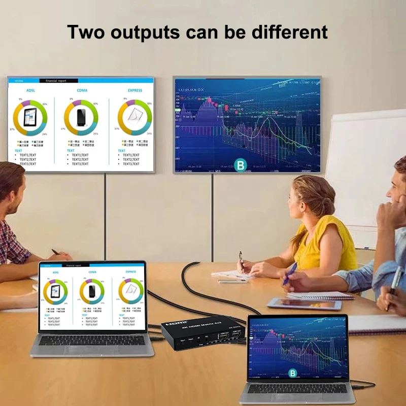 Este es nuestro nuevo producto, esta matriz HDMI 4x2 puede conectar 4 fuentes de señal HD a 2 terminales de pantalla HD