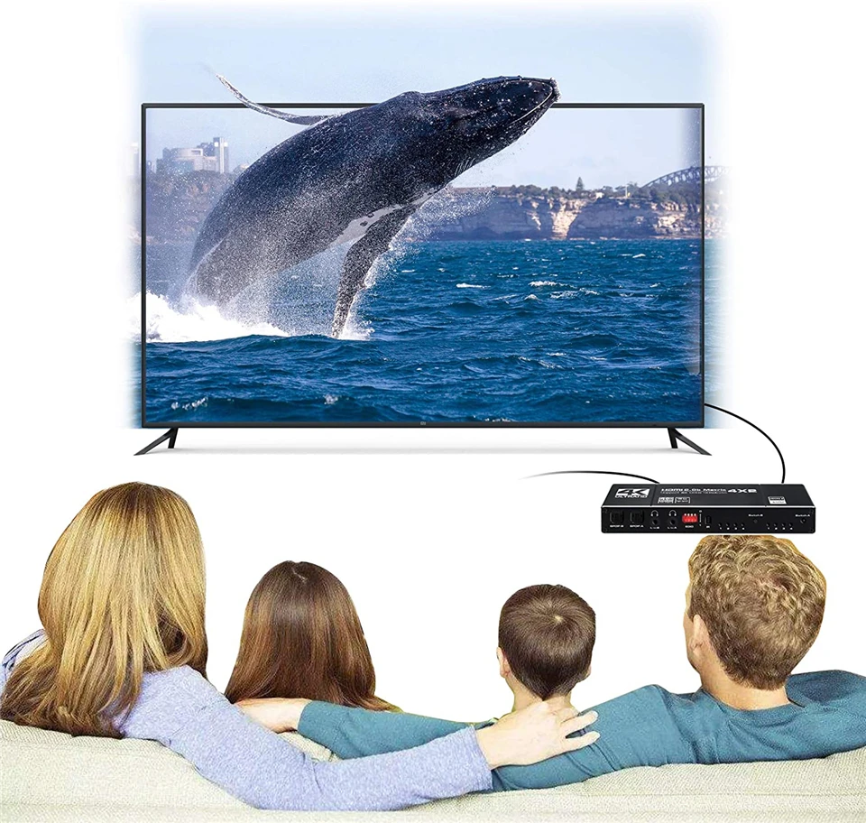 [Matriz HDMI de 4 entradas y 2 salidas] La matriz HDMI le permite conectar cuatro fuentes de señal 4K HDR a dos pantallas o proyectores HD al mismo tiempo. Es la combinación de divisor HDMI e interruptor. Cualquier puerto de salida puede realizar una salida de audio independiente por SPDIF/fibra óptica o auriculares estéreo L/R. La carcasa de aleación de aluminio proporciona durabilidad y ayuda a disipar el calor. Conveniente para el trabajo y el hogar, la distribución de información, la presentación en la sala de conferencias, la escuela y los entornos de capacitación corporativa.