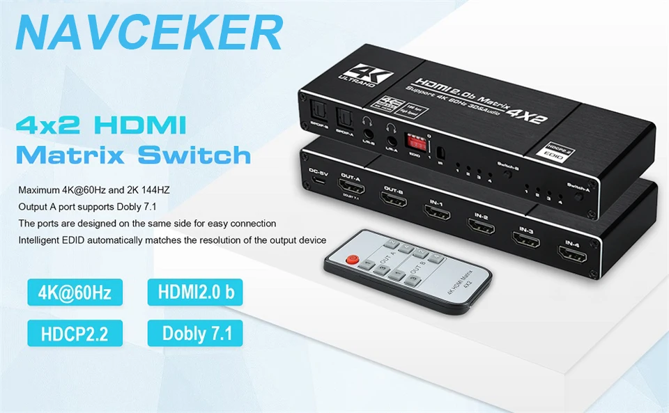Navceker 4x2 HDMI Matrix Switch es con 4 entradas HDMI y 2 salidas HDMI, por el momento. Es una matriz verdadera y puede distribuir cualquiera de las 4 fuentes a cualquiera de las 2 pantallas, y puede funcionar como un divisor para mostrar la misma fuente en 2 pantallas simultáneamente. Admite resoluciones de entrada y salida de hasta 4K x 2K/60HZ