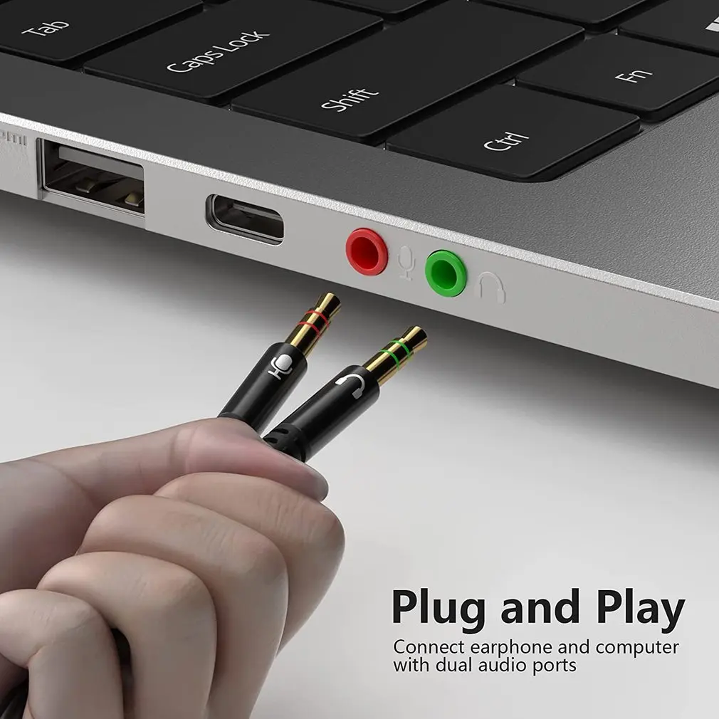 Dos puertos macho: uno para Puerto de auriculares en su PC/portátil/teléfono, otro para Puerto de micrófono en su PC/portátil/teléfono.