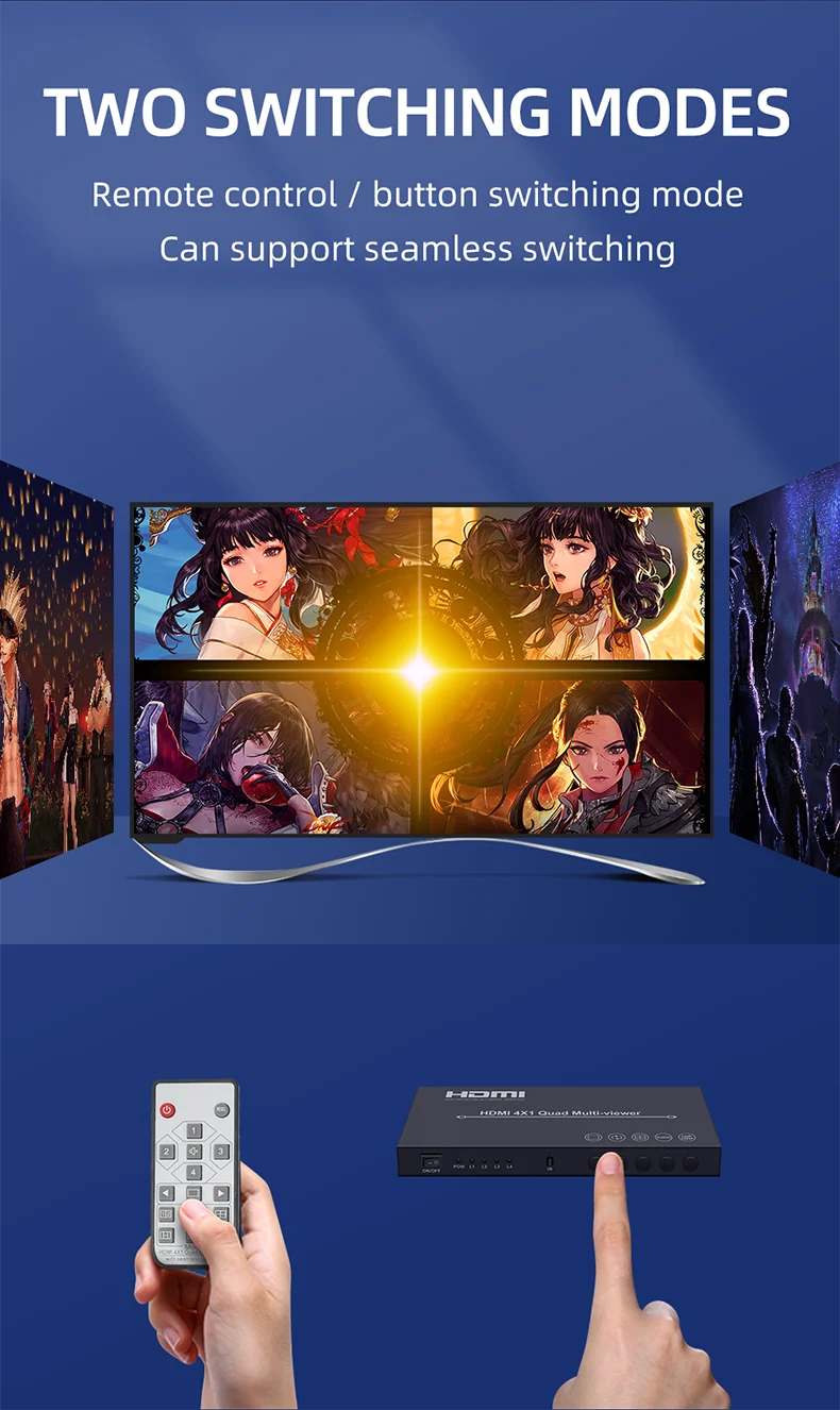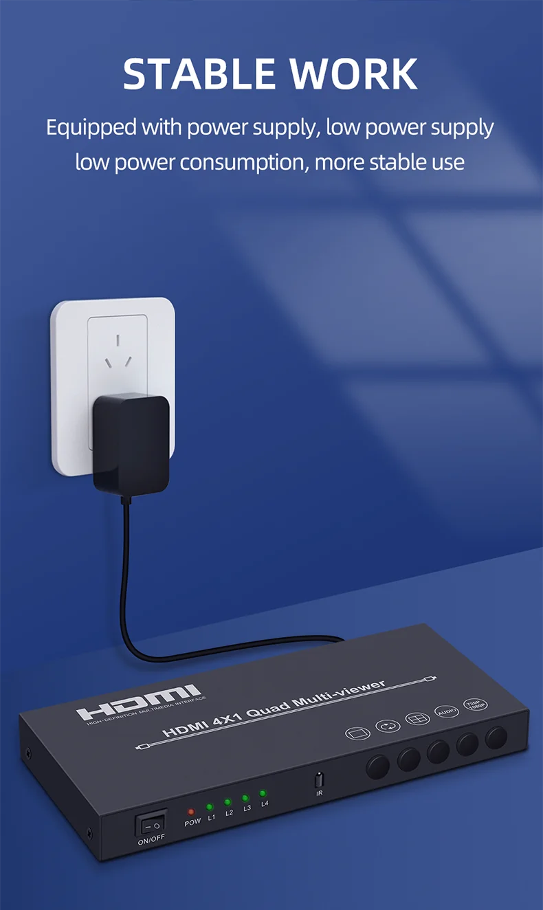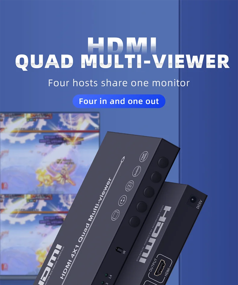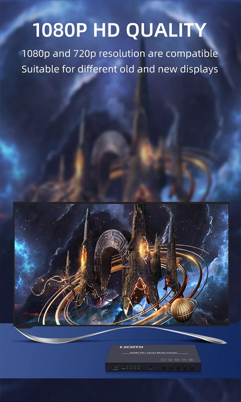 Este producto es un alto rendimiento 4 por 1 Quad Multi-Viewer. Admite cuatro pantallas de fuente de entrada de alta definición en una pantalla y tiene tres modos de Efecto multivista.