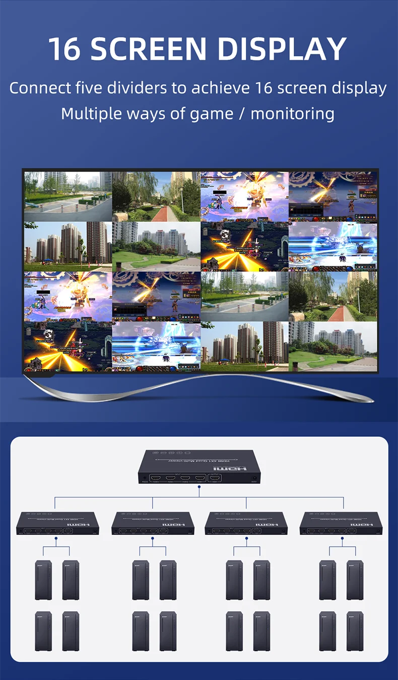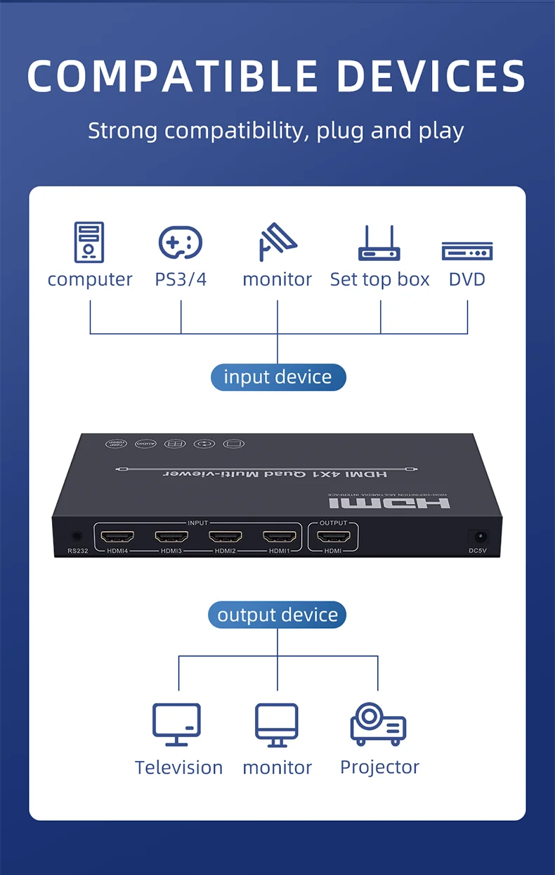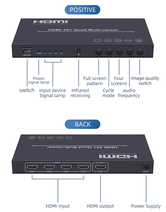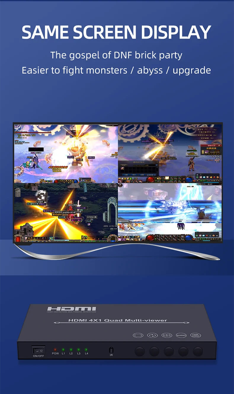 Este producto es un alto rendimiento 4 por 1 Quad Multi-Viewer. Admite cuatro pantallas de fuente de entrada de alta definición en una pantalla y tiene tres modos de Efecto multivista.