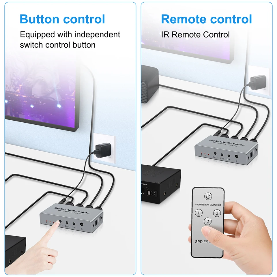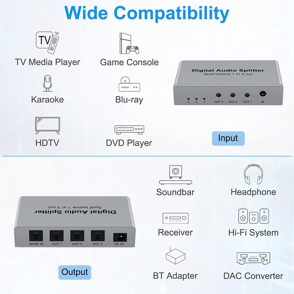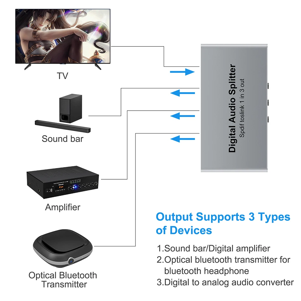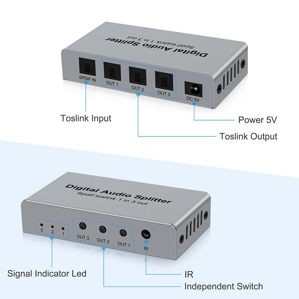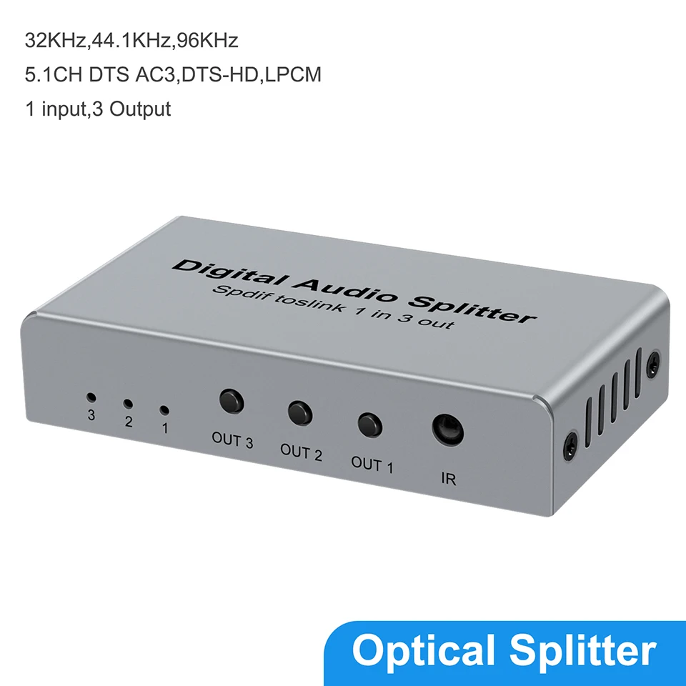 Divisor óptico Spdif Toslink de 3 vías, 1x3, divisor de Audio Digital óptico, soporte de aluminio de 1 entrada y 3 salidas, DTS AC3 con Cable de alimentación