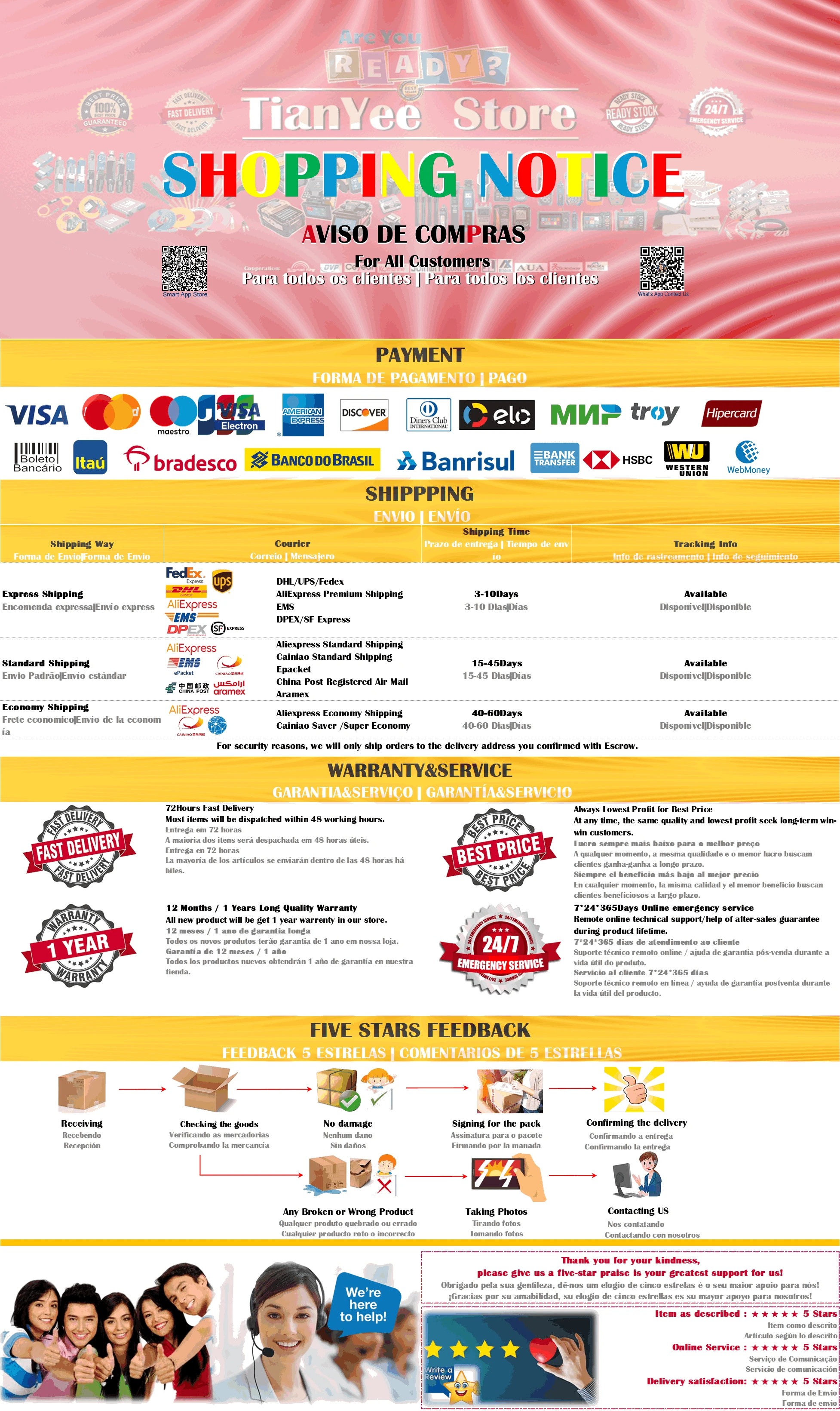 ImportanteTO compradores, antes de su pedido, por favor visite y lea claramente nuestro acuerdo. Basándonos en su orden de compra final, creemos que ha leído y aceptado claramente los siguientes requisitos que presentamos, y puede cumplir con sus compromisos según lo requerido por el contrato.