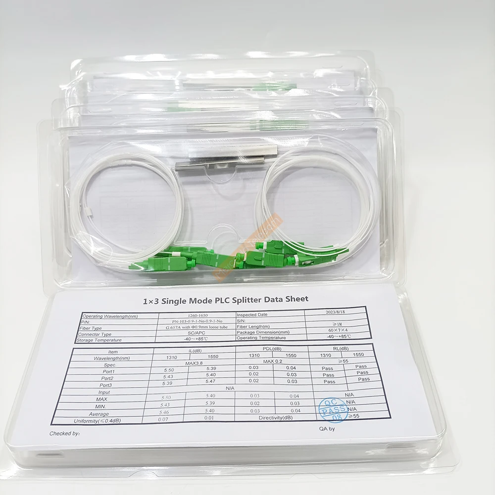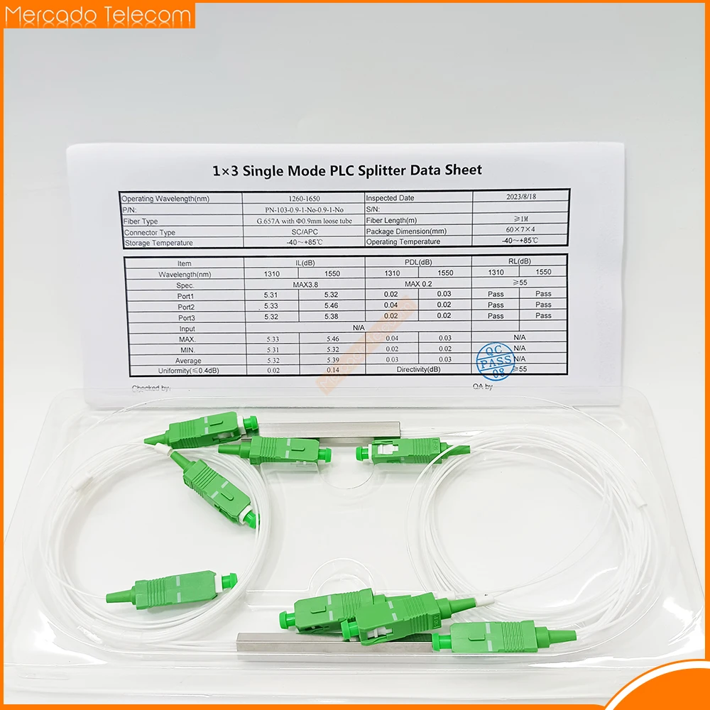 1x3 PLC Splitter Mini tipo, fibra SM, cable de fibra óptica OD: 0,9mm pigtail,1m de longitud, con conector SC/APC