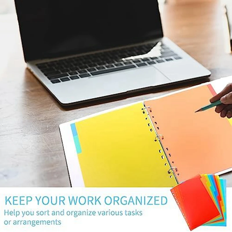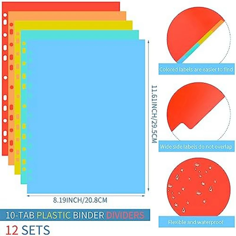 Hay 12 juegos de 3 separadores de anillos etiquetados; Cada divisor contiene 10 etiquetas en blanco de colores brillantes con un total de 11 agujeros, lo que significa que puede satisfacer fácilmente sus necesidades diarias Tamaño adecuado: nuestros separadores de plástico miden aproximadamente 8,19x11,61 pulgadas/20,8x29,5 cm; se adapta a carpetas de tamaño estándar, proporciona la máxima cobertura y tendrá una experiencia agradable CONFIABLE Y PRÁCTICO: Nuestro divisor de páginas está hecho de plástico de polipropileno, que es fuerte, resistente al desgarro, impermeable y confiable; lo que significa que se puede reutilizar para varios proyectos, para que puedas usarlo durante mucho tiempo FÁCIL DE USAR: Nuestros 3 divisores de carpeta tienen un total de 10 pestañas en blanco en el exterior; 5 colores brillantes para una fácil Organización y visualización de notas y documentos, identifica y Agrupa fácilmente sus documentos SIMPLIFICA TU VIDA: estudiantes, profesionales o cualquier persona que necesite mantenerse al día con la vida pueden usar nuestros divisores de plástico, 3 clips de carpeta para ordenar y organizar fácilmente varios trabajos o arreglos, mantén tu trabajo y vida organizados.
