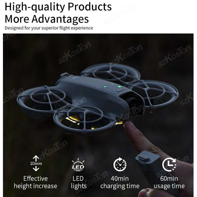 2.El trípode luminou puede aumentar la distancia entre la parte inferior del DJI NEO y el suelo en 10 mm, lo que puede reducir el impacto durante el aterrizaje y también proteger la batería para brindar protección segura al aterrizaje.