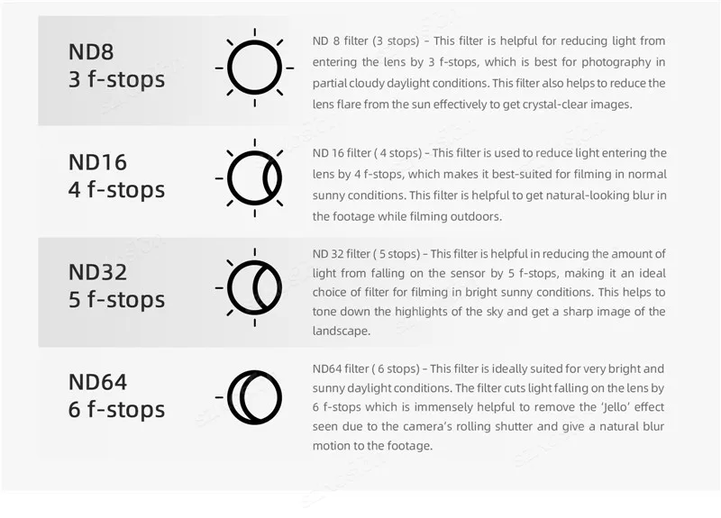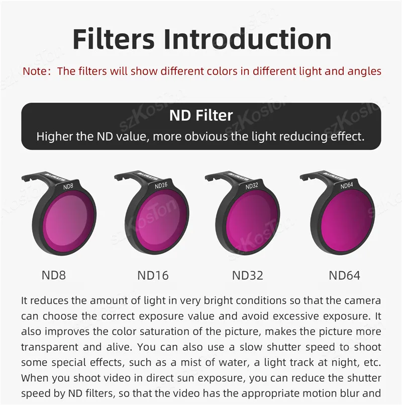 Picture: Strong light environment, prevent overexposure, resist scattered light, increase color saturation, and make the picture more transparent and bright. Realize large-scale effects such as fog-like flowing water and night light track. Video: Decrease the shutter speed so that the video picture has proper motion blur and looks more comfortable.