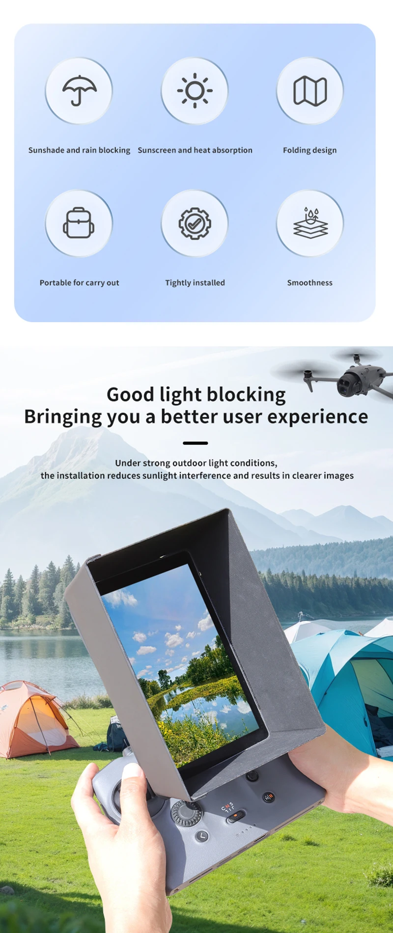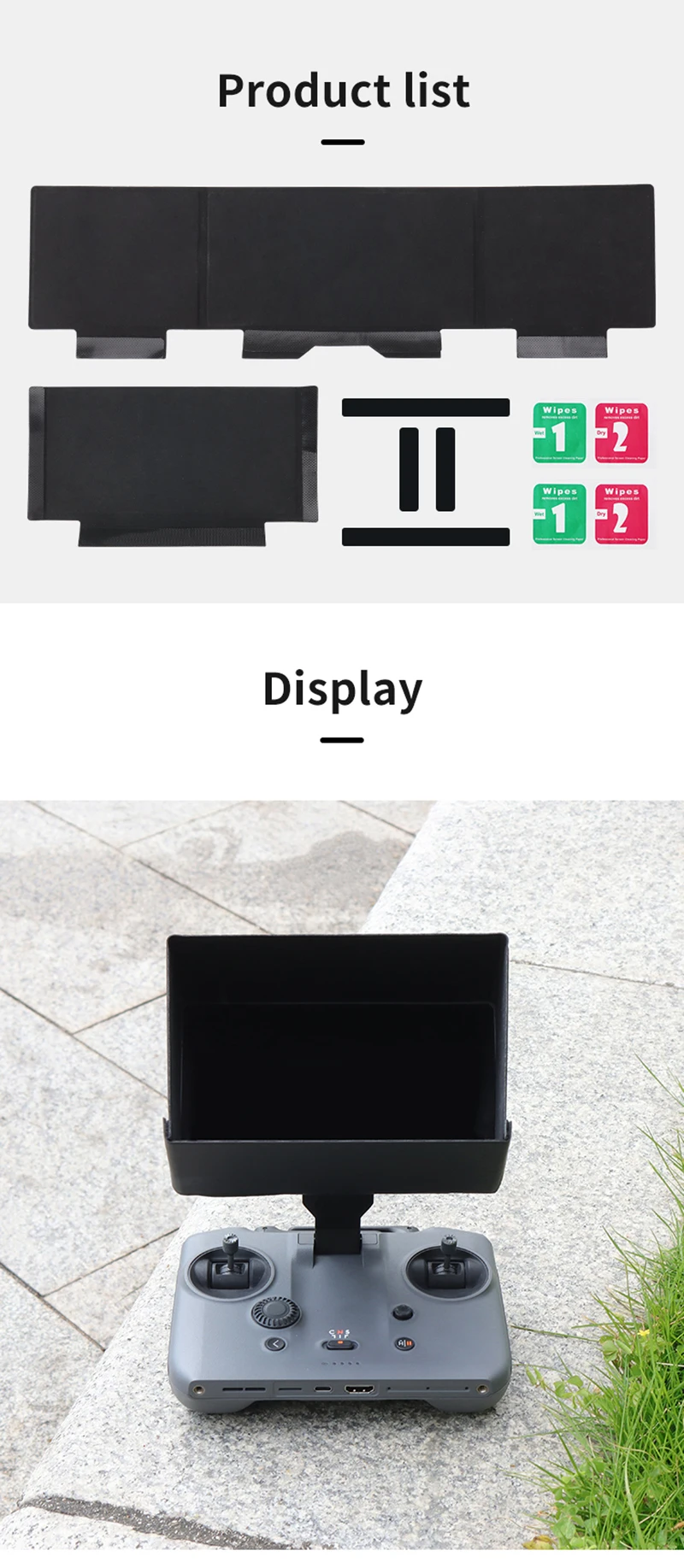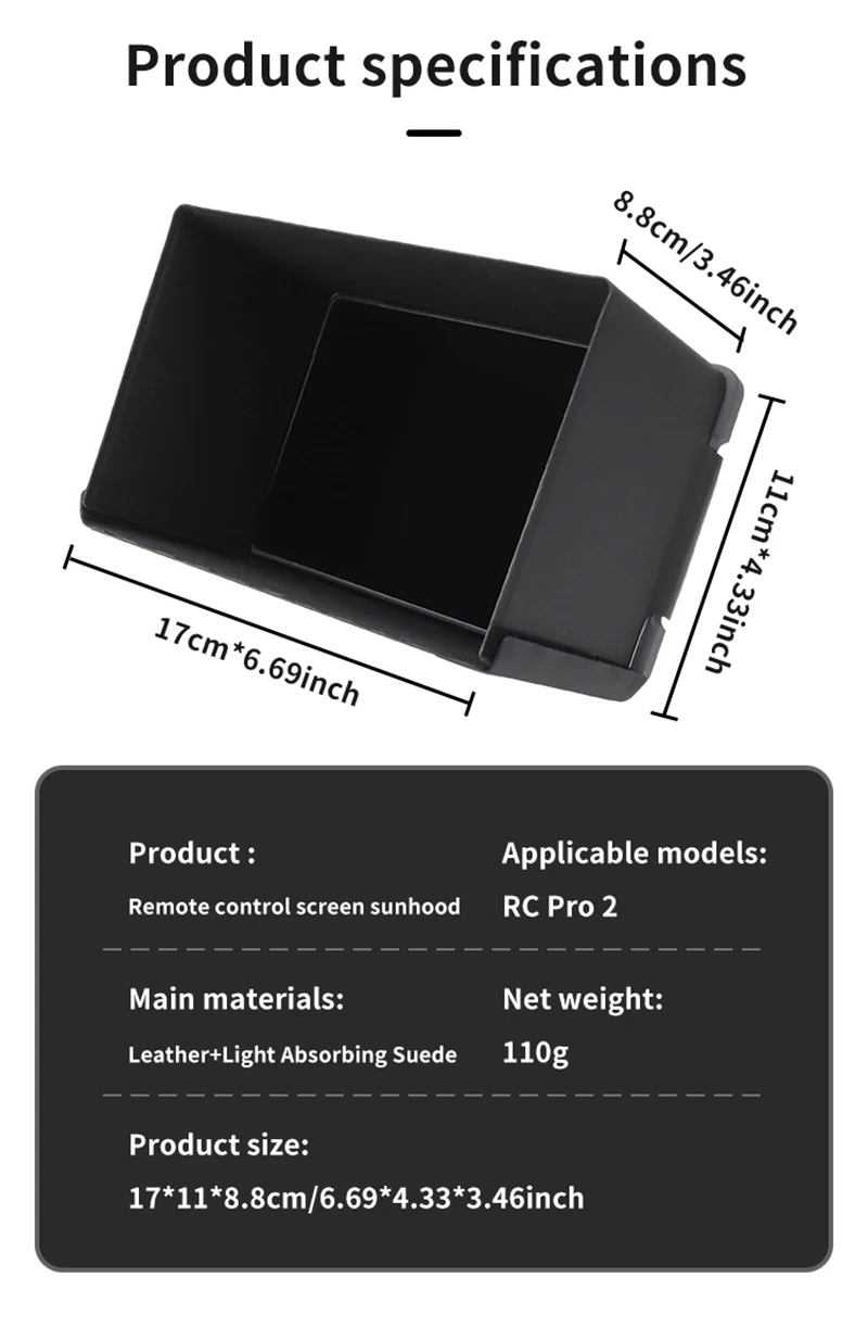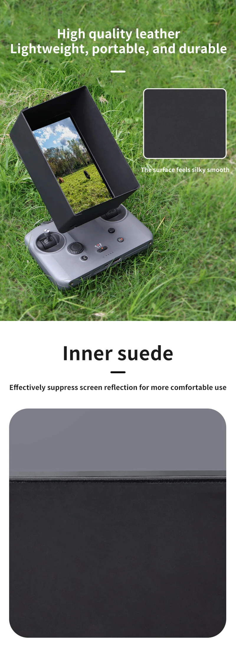 1.El protector de lente de pantalla RC Pro2 está hecho de material de gamuza absorbente de cuero, diseño cerrado de cuatro lados, no permitirá que el lado izquierdo se escape y refleja la luz al disparar, el cuero de alta calidad es liviano y portátil, duradero, sedoso en la superficie y gamuza. En el interior, suprime eficazmente el reflejo de la pantalla, más cómodo de usar, impermeable, a prueba de salpicaduras, antiincrustante, diseño limpio y plegable, no es necesario desmontar la capucha, después de plegarlo,