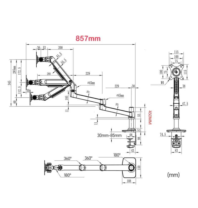 Comprar DL-8013-450 resorte mecánico 1-10kg 3 ojal de abrazadera de brazo largo 100x100 75x75 soporte de mesa para portátil 15 "-32" soporte de escritorio para monitor