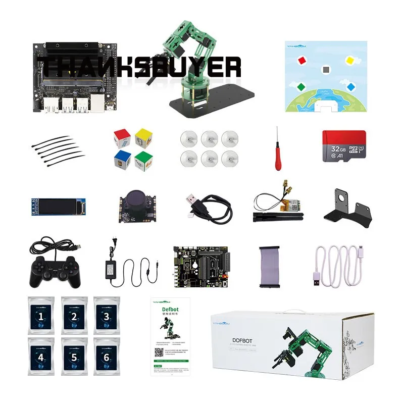- Control de interconexión multiplataforma.Aplicación multifuncional para teléfono móvil para IOS/Android: múltiples juegos AI integrados, visualización en tiempo real de la pantalla de reconocimiento del brazo del robot y soporte de la interacción de gestos, seguimiento de movimientos, clasificación de basura y otros juegos al mismo tiempo.Control por computadora host de PC: además de la pantalla de video de la cámara FPV, la computadora host también ha agregado un modelo de simulación 3D del brazo robótico.El modelo 3D y la entidad giran sincrónicamente, permitiendo combinar la teoría y la práctica del control del brazo robótico.Control remoto del gamepad USB: además de la aplicación del teléfono móvil y el control por computadora, también hay un gamepad USB para experimentar la diversión de combinar múltiples grados de libertad y múltiples teclas.