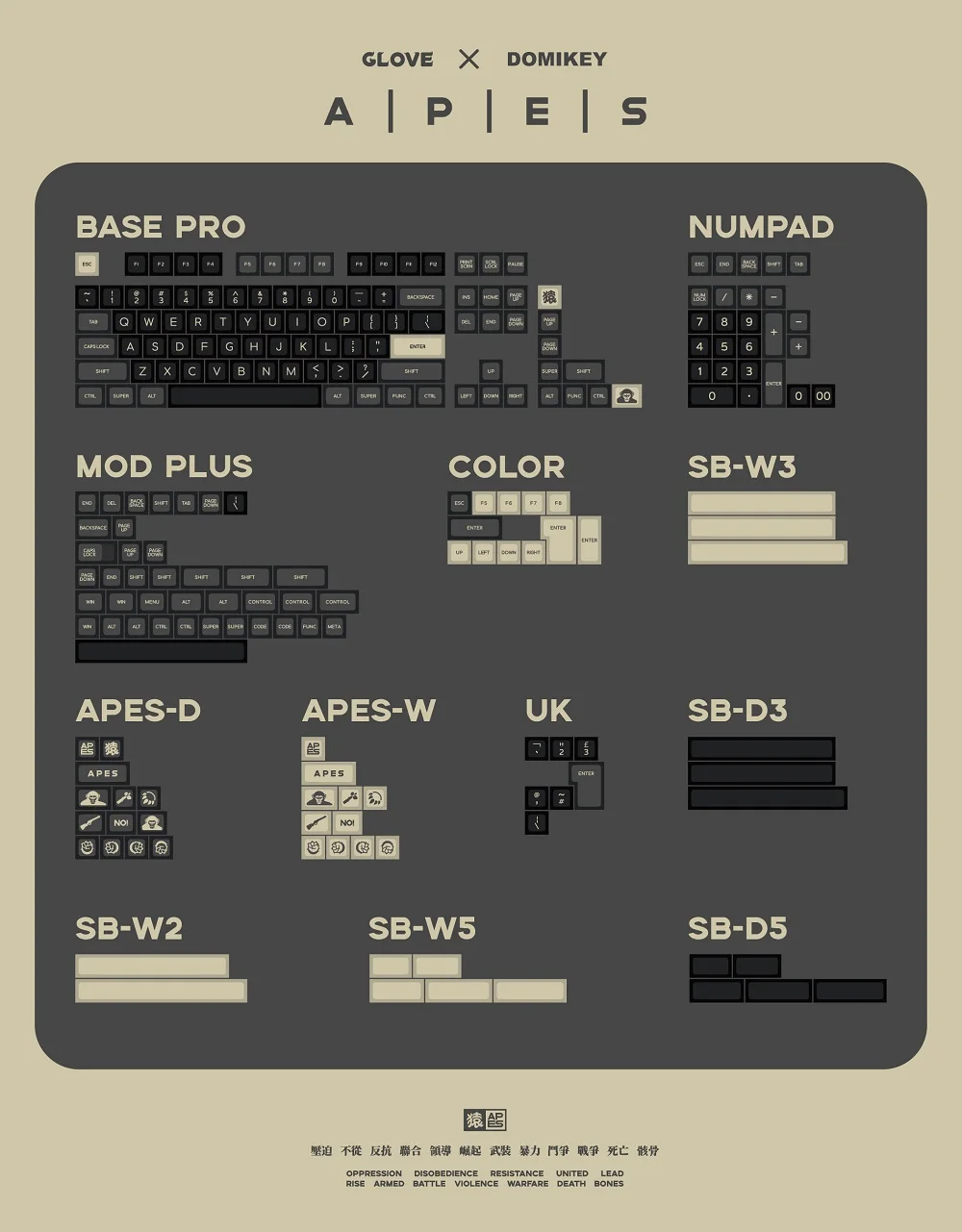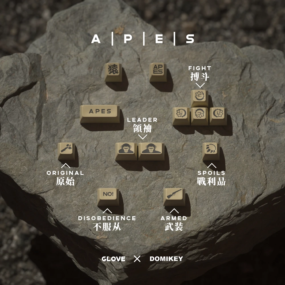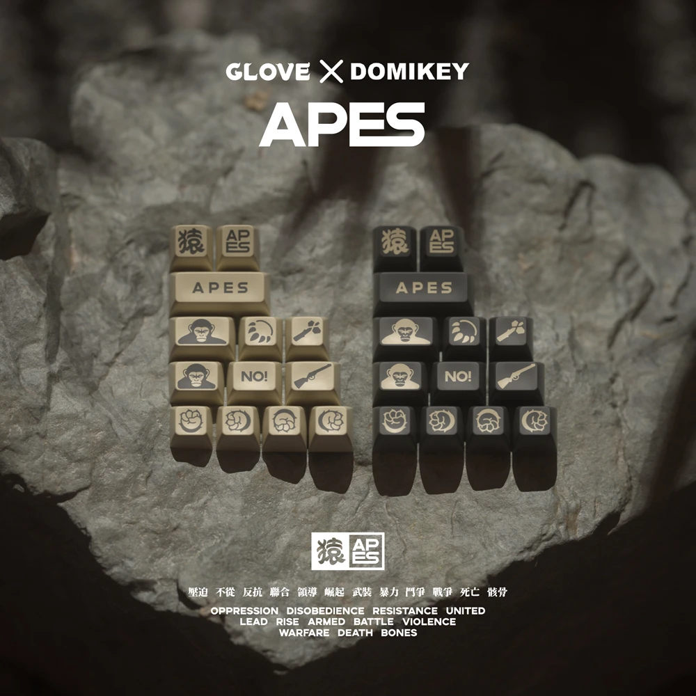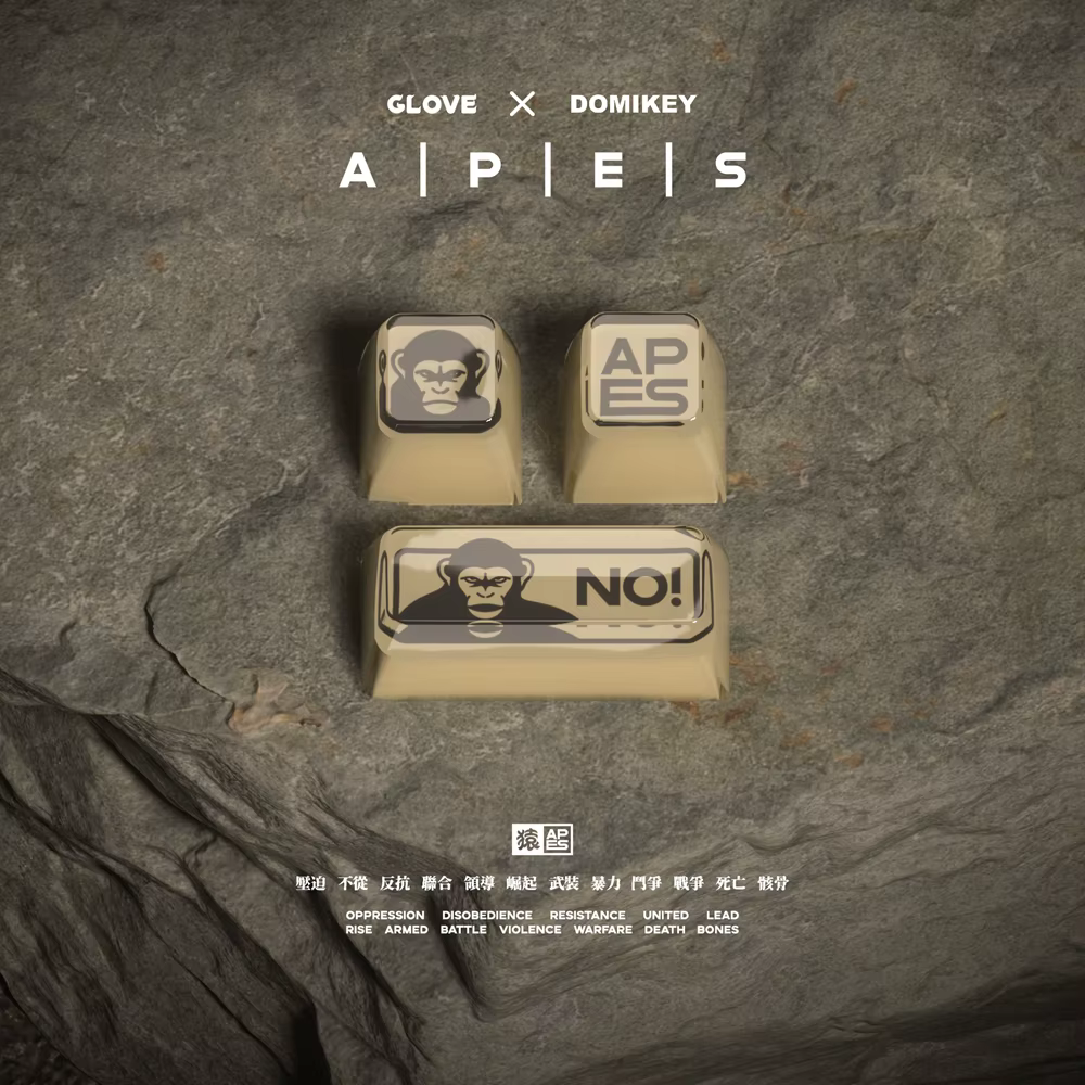 Inspired by the classic movie series the planet of the Apes (Rise of the planet of the apes, Dawn of the planet of the apes and War for the planet of the apes).The NO from Caeser is complicated. It is sad, angry, helpless and hopeless etc. As a first intelligent Ape, as an ape that is well-developed with full emotions of human beings, Caeser eventually stands out and tries his best to guide and lead his groups to protect themselves and to live together with humankind.It is not just a movie about the conflict between humans and animals, the science of the future, but also about how we live.GLOVE team takes three colours - black, grey and yellow to reflect what they feel from the movie. Weapons, disobedience and violence become the theme of their APES TIMES keycaps. However, the main theme is anti-war and violence. Caeser's fight is the fight that we have to do for our life as well.ABOUT SPECSA profile (sculpted 1-1-2-3-4-4)Compatible with Cherry MX and clonesABS plasticDoubleshot legendsStripe bottomPls Pay Attention: Keycap Only, not including other things.