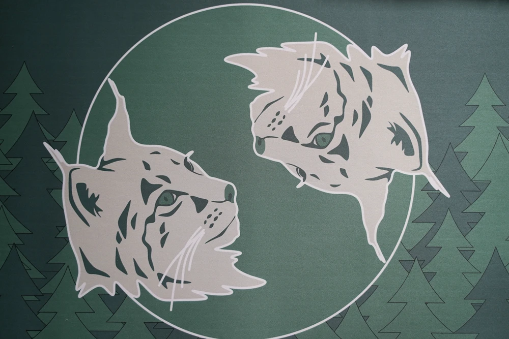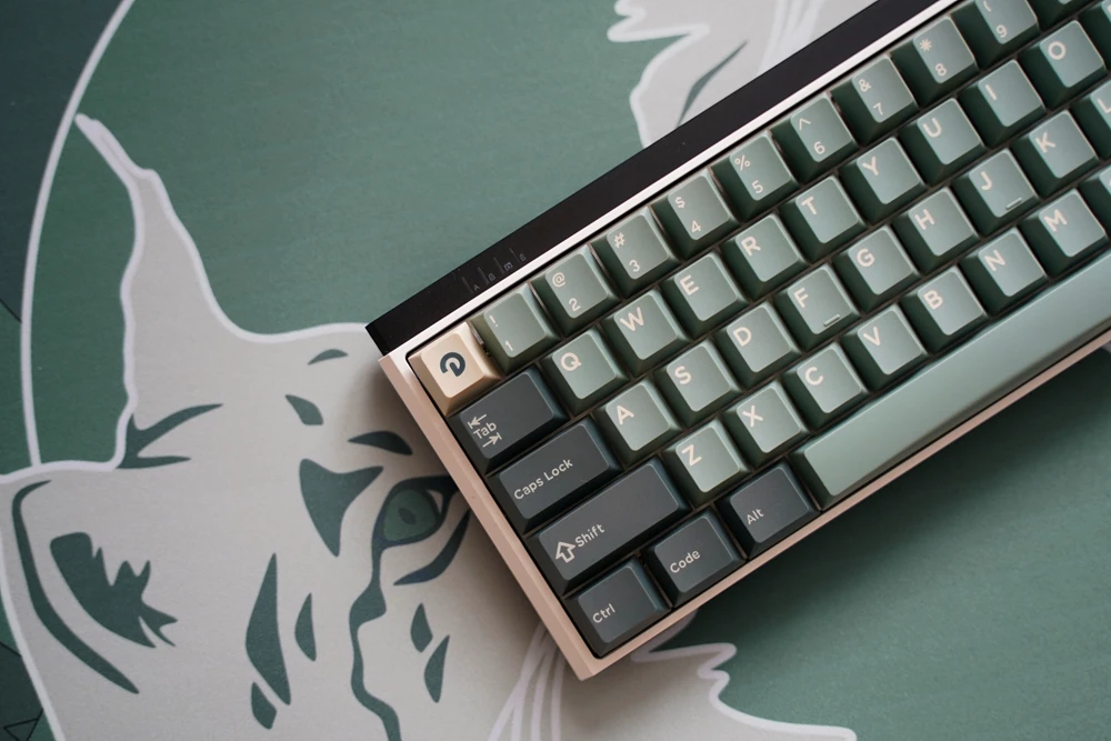 INKY elige dos verdes con champán y raíz naranja para representar un bosque floreciente en las teclas. Eligen la figura del lince como elemento en la alfombrilla de ratón del bosque silencioso.
