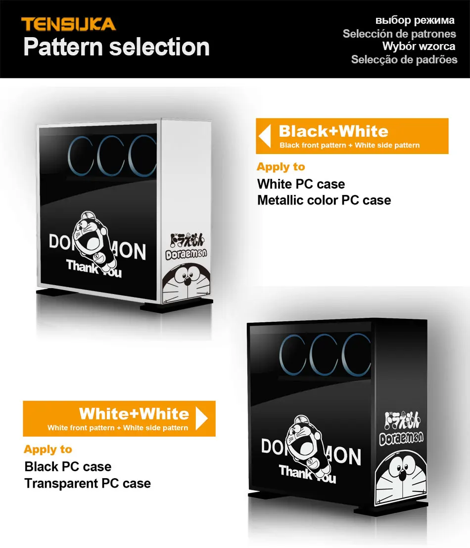 4. Este producto incluye una pegatina de patrón frontal, una pegatina de vidrio lateral y una pegatina de texto. Seleccione la pegatina adecuada para el color de su funda de PC de acuerdo con la ilustración